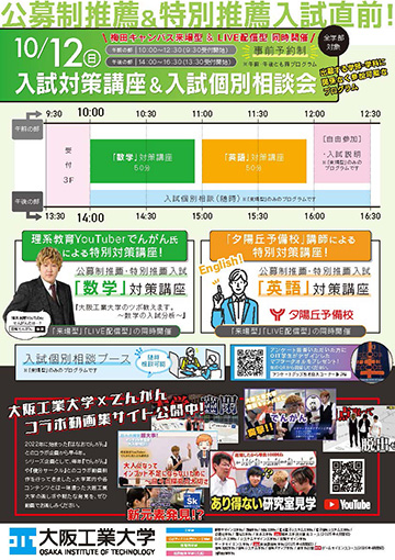 大学案内や各コンテンツとは一味違った大阪工業大学の楽しさや新たな発見を、ぜひ動画でお楽しみください。でんがんコラボ動画集サイトへ 予備校講師による特別対策講座