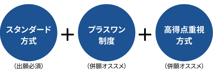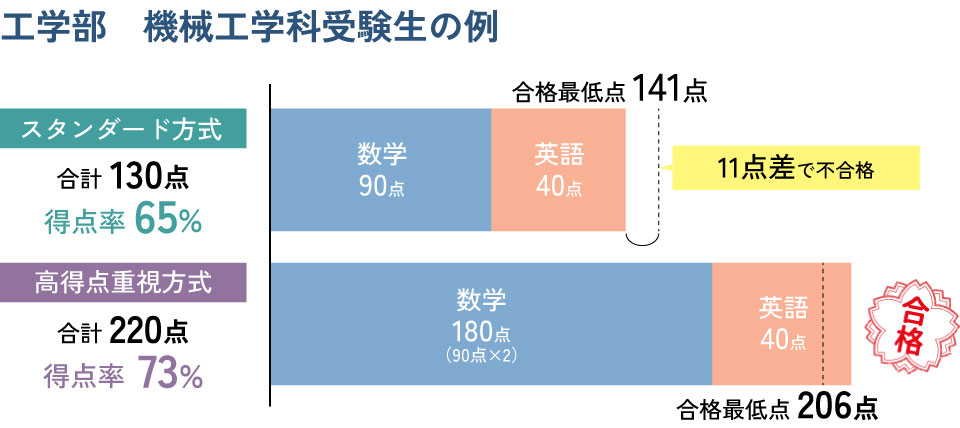 - 高得点重視方式を併願すると、高得点教科の得点を2倍して合格判定を行うため、得意教科を生かすことができます。