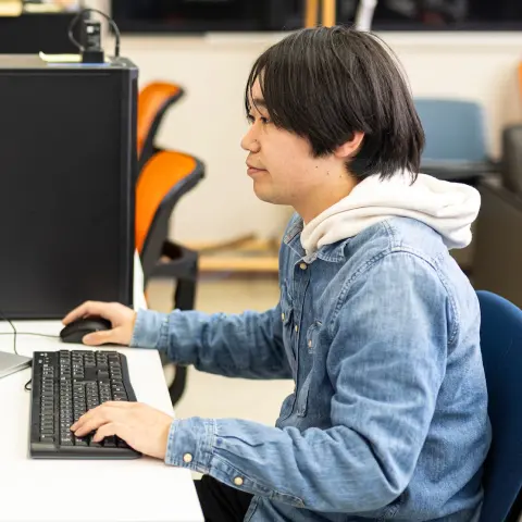 実証実験施設「DXフィールド」を活用し、1年次からドローンをプログラミングで動かすなど、実践的な学修に取り組みます。併設の農園では、IoT(モノがインターネットにつながる技術)やセンサー、ロボットなどを使ったスマート農業の研究を、DXフィールドでは、全方位カメラによる映像解析やスポーツの動きの計測・データ分析など、実世界をテーマに新しいサービス創りに挑戦できます。