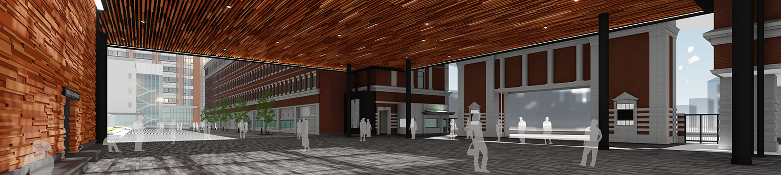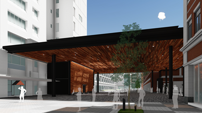 見通しの良い空間には、ビッグデジタルサイネージや高性能な音響システムを導入し、学生や来訪者へ多様な情報を発信します。これにより、学生のいきいきとした活動の様子がキャンパス全体に広がります。また、大きな庇空間を設けることで、雨天に左右されることなく、新入生歓迎フェスティバルや城北祭(学園祭)、オープンキャンパス、地域開放イベントなど、さまざまな催しを実施できる場となります。こうした取り組みにより、魅力あふれる大学として情報を発信し続けるキャンパスづくりを目指します。