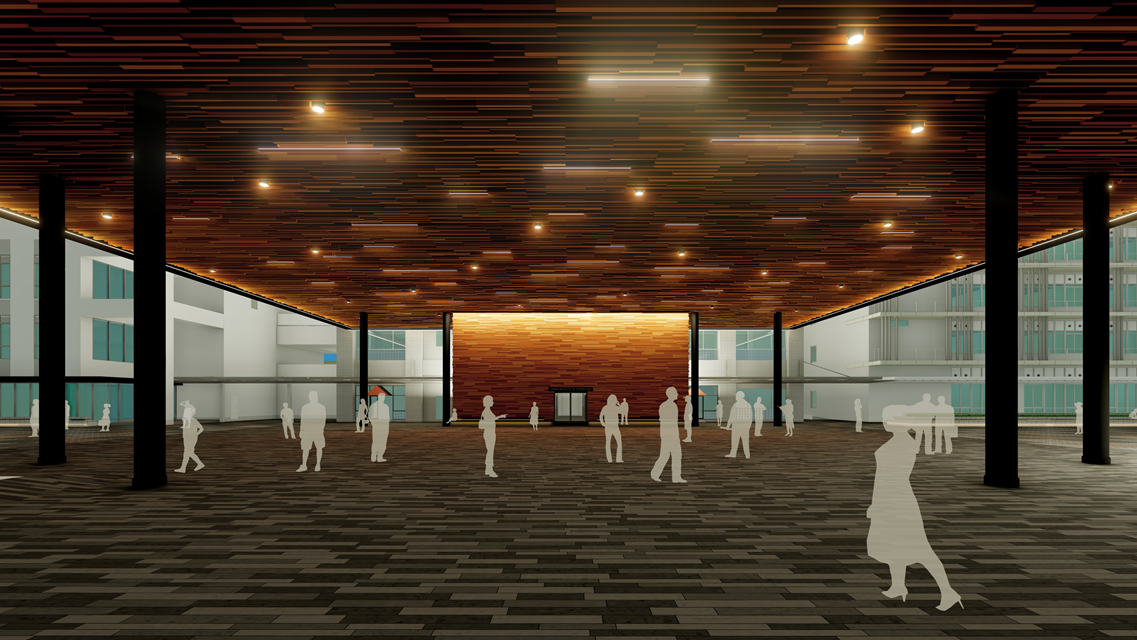 キャンパス中央に多くの学生を抱くような大きな屋根を架け、内部に大きなトップライトを設け、差し込む光を木製のルーバーにより程よく和らげ木漏れ日の中にいるような柔らかい空間をつくります。学生が⾧く居たくなるような心地良い空間を提供し、キャンパスに抱かれるような場を創出します。