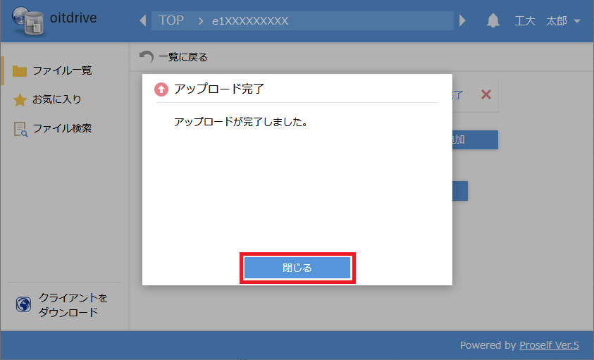 - 表示されたメッセージが「アップロードが完了しました。」であることを確認し、「閉じる」をクリックします。
