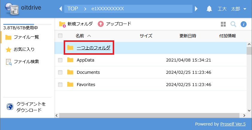 - 元のフォルダーに戻るには「一つ上のフォルダー」をクリックします。