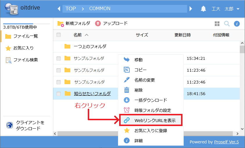 - リンクを取得したいフォルダやファイルの上で右クリックし、「WebリンクURLを表示」をクリックします。