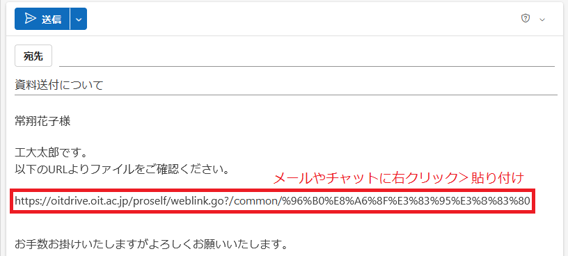 - メールやチャット等に右クリック>「貼り付け」し、伝えたい相手に送ります。