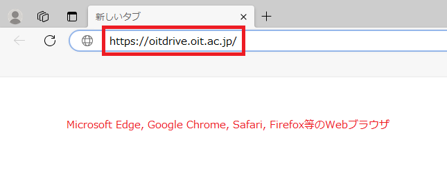 - Webブラウザ(Microsoft Edge, Google Chrome, Safari, Firefox等)でhttps://oitdrive.oit.ac.jp/にアクセスします。