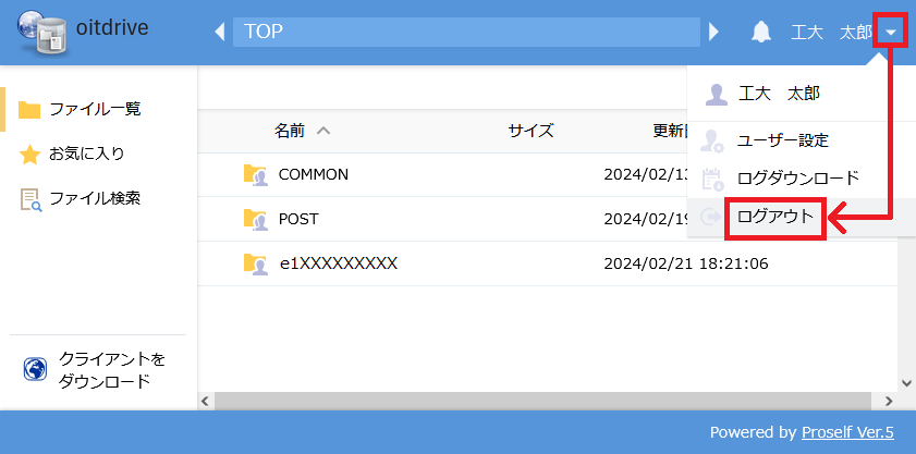 - ログアウトするには右上のプルダウンメニューより「ログアウト」をクリックします。