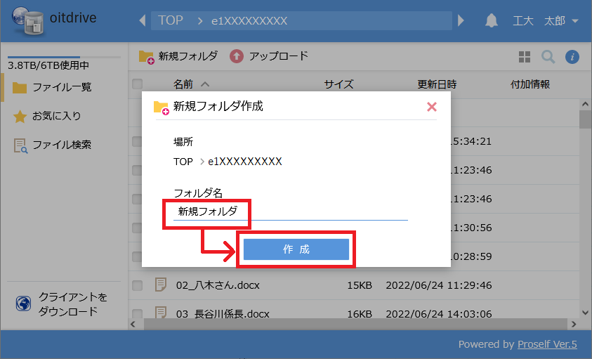 - 「フォルダ名」の欄に任意の名前を入力し、作成をクリックします。