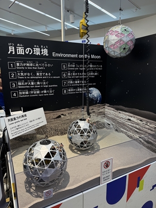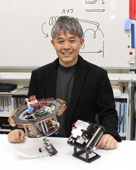 私たちは月面を探査するロボットの研究を2017年からスタートさせました。きっかけは、小型人工衛星「まいど1号」を2009年に打ち上げた東大阪市の「宇宙開発協同組合SOHLA(ソーラ)」から、新たに作るロボットの共同研究に誘われたことでした。私たちが形状記憶合金を使った機構の開発を担当し、月面跳躍移動ロボット「まいど2号」が誕生しました。2025年日本国際博覧会(大阪・関西万博)にも展示されました(写真1)。