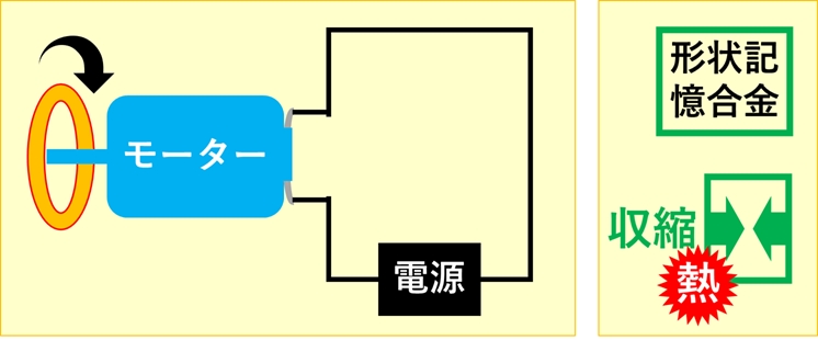 • (図3)㊧電動モーターは電気エネルギーを回転エネルギーに変換する㊨月探査ロボットでは、形状記憶合金の熱エネルギーによる収縮を駆動源とした