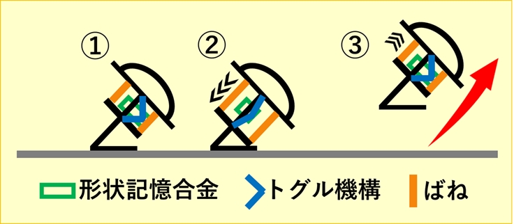 • (図5)①最初の状態②形状記憶合金を通電加熱すると、収縮によりトグル機構が伸びてばねが伸長③トグル機構を開放すると、ばねが一気に収縮して跳躍