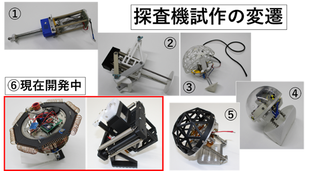 • (写真2)研究室で開発している「任意方向へ転換できる月溶岩洞窟探査機」(左)と「砂をかいて跳躍する小型月面探査機」