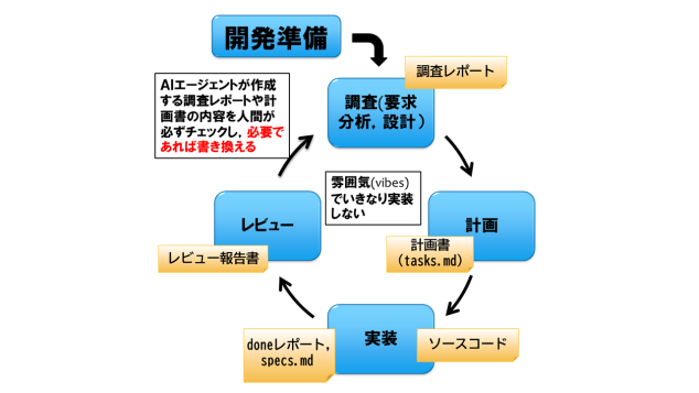 (図1)仕様駆動開発では、「調査」「計画」「実装」「レビュー」の各ステップでAIに成果物を作らせ、人間がそれぞれを確認して開発を進める