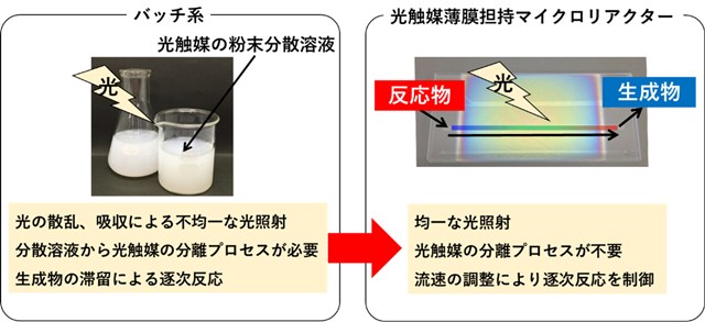図1 バッチ系とマイクロリアクターの光触媒反応の比較 -