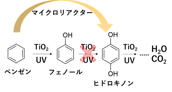 これまでの研究により、光触媒薄膜担持マイクロリアクター中において、ベンゼンはバッチ系反応容器とは異なる化学反応を起こすことが分かっています(図2)。この反応メカニズムを解明することで、「微小な反応空間」で起こる新たな化学反応について理解すること目指しています。