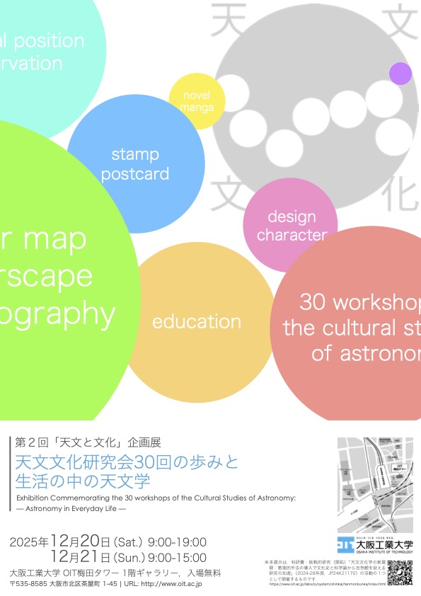 天文文化研究会の第30回開催を記念して,2007年の発足以来今日まで継続してきた研究会の足跡について,その概要を梅田キャンパス来場者に紹介する展覧会を企画しました.今回の展示は「天文と文化」をテーマとする企画展の第2弾となるものです.