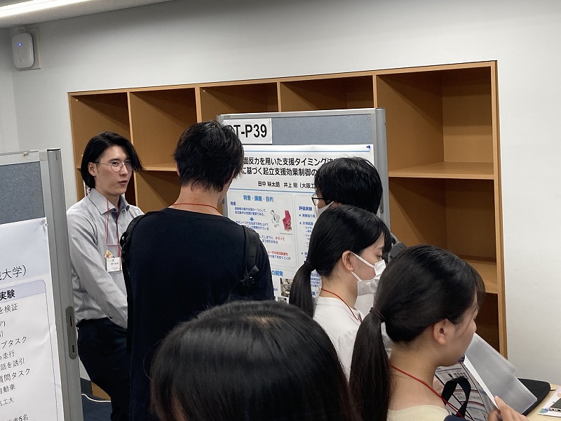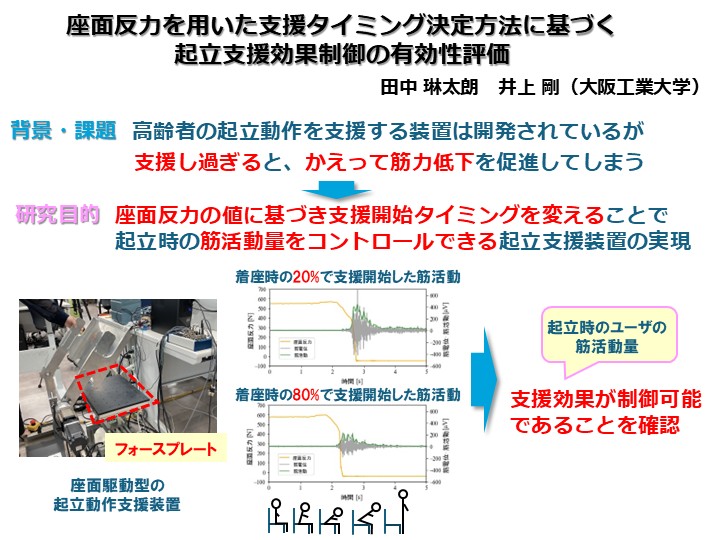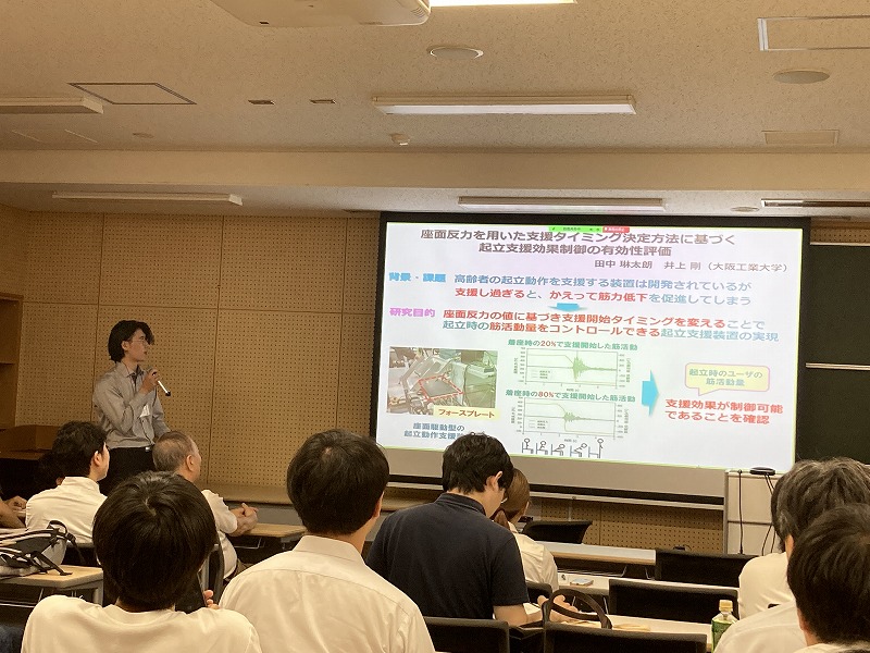 2024年09月18日(水)~20日(金)に京都大学吉田キャンパスで開催された「ヒューマンインタフェースシンポジウム 2024」で研究室の田中君が発表を行いました。 発表のタイトルは「座面反力を用いた支援タイミング決定方法に基づく起立支援効果制御の有効性評価」です。本発表では、ユーザの起立動作に合わせて座面を駆動し,臀部を持ち上げることにより起立動作を支援する装置において、着座している椅子の座面反力を用いて支援装置の駆動タイミングを制御する手法を提案します。また、同手法を実装した起立動作支援装置により座面の駆動開始タイミングを変化させた際の起立動作の筋活動量の減少率を実験により示し,支援効果の制御可能性について発表しました。
