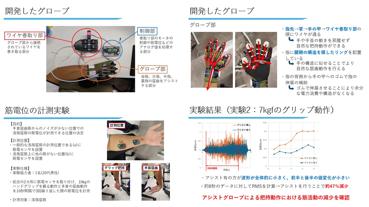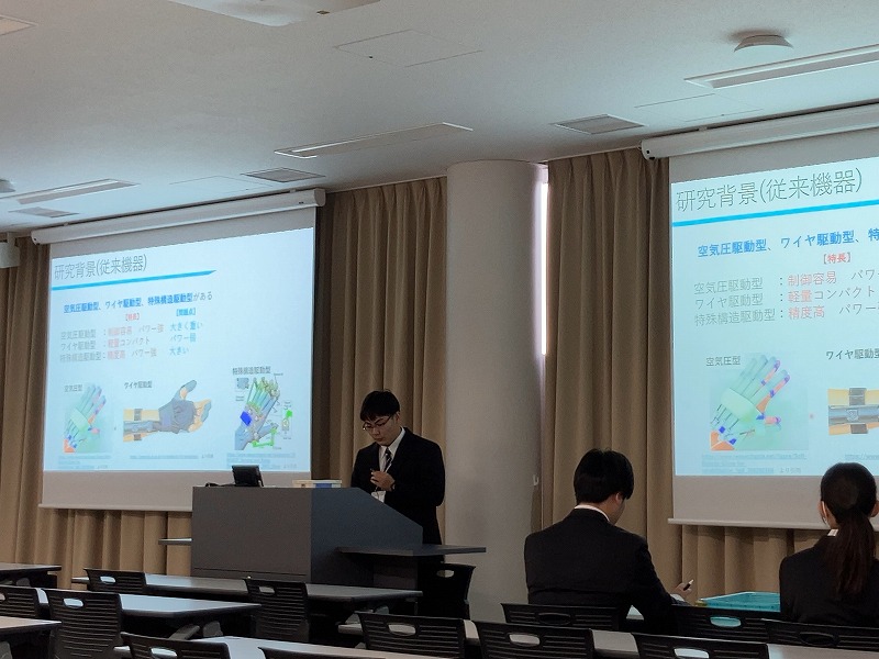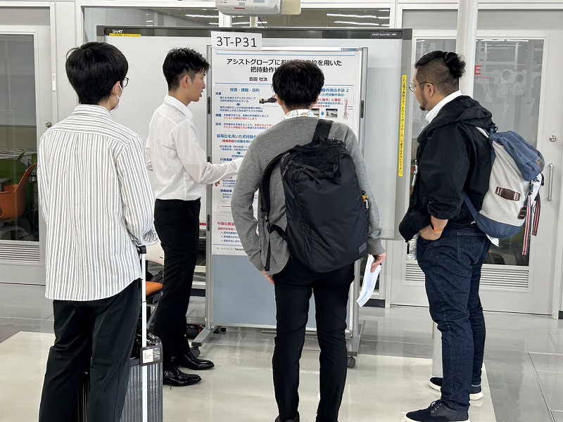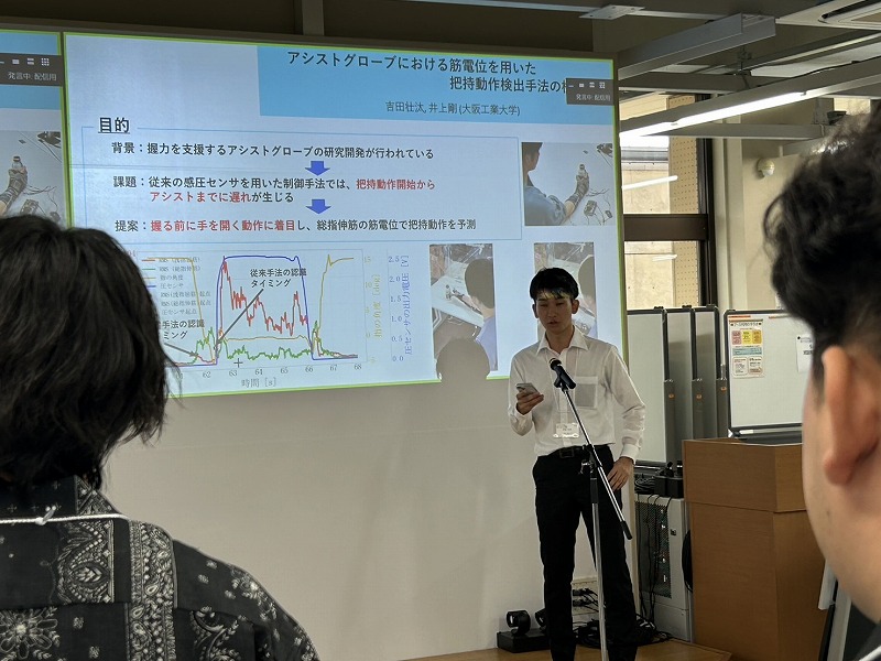 2024年11月30日(土)に摂南大学の寝屋川キャンパスで開催された「2024年度 日本人間工学会関西支部大会」で研究室の上田君が発表を行いました。 発表のタイトルは「筋電位を用いたワイヤ駆動型アシストグローブの開発」です。本発表では、上田君が開発した、筋電位信号で支援開始を制御するワイヤ駆動型アシストグローブ(指先をワイヤで引くことにより指の屈曲を支援するグローブ)とその評価結果について発表しました。