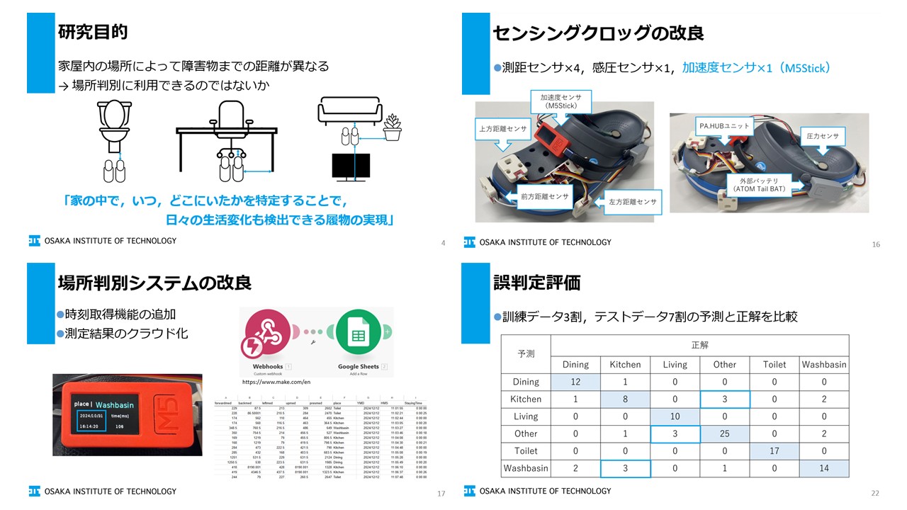 2025年3月13日(木)~15日(土)に立命館大学の大阪いばらきキャンパスで開催された「情報処理学会 第87回全国大会」で研究室の吉村さんが発表を行いました。 発表のタイトルは「センサを装着した履物を用いた家屋内場所判別システムの開発」です。高齢者が家の中で、いつ、どこにいたかを特定することで、緊急時はもちろん、日々の生活変化も検出できる履物を実現することを目的としました。M5Stickとセンサをクロッグに取り付けたセンシングクロッグを試作し、そのセンサの測定結果に基づいて場所の判別を行った結果について発表しました。 発表後は大学の食堂でラーメンを食べました(o^―^o)ニコ