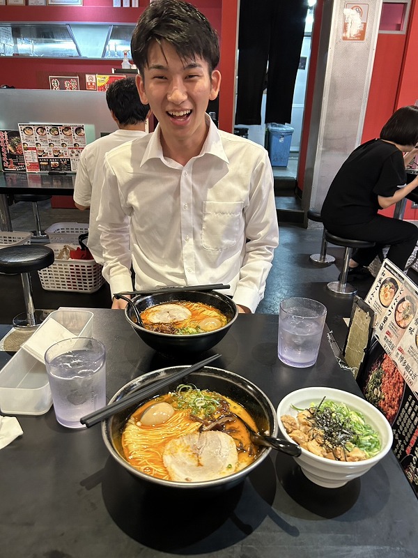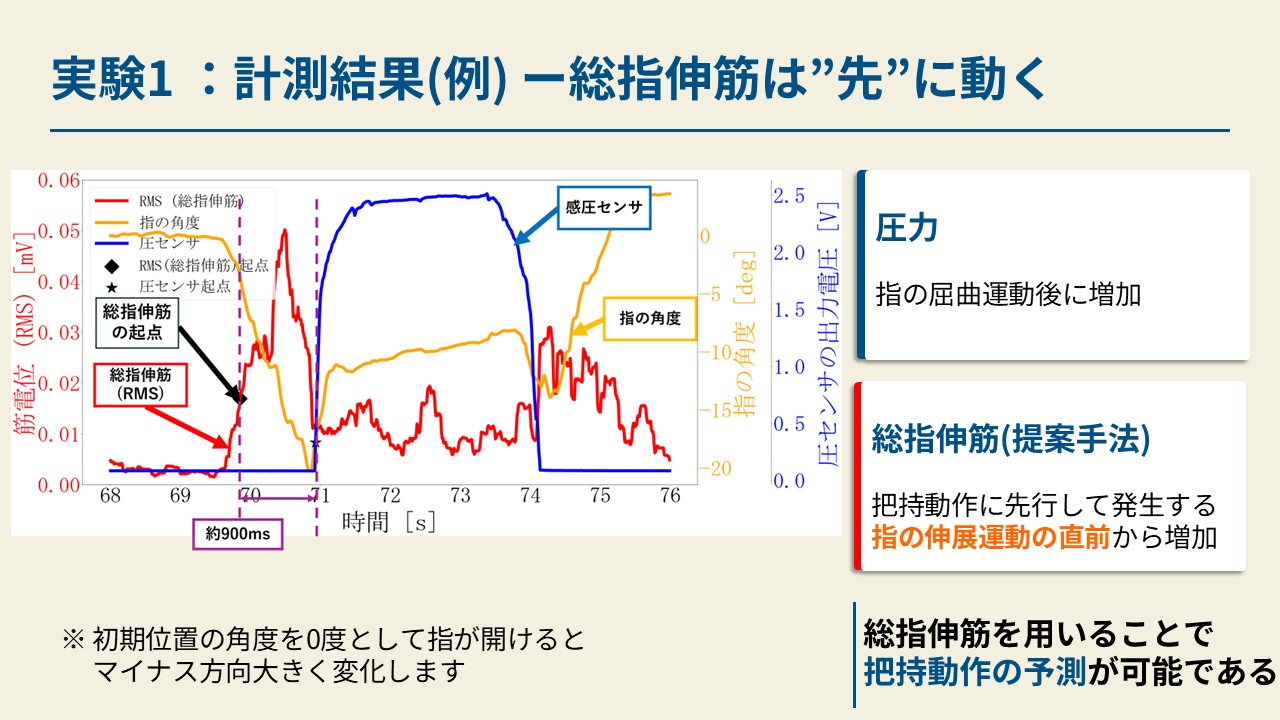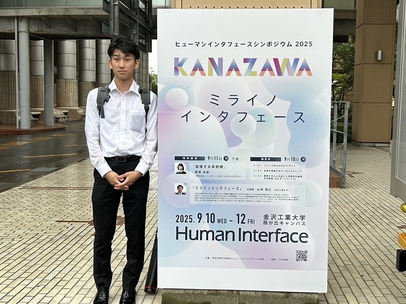2025年9月10日(水)~12日(金)に金沢工業大学の扇が丘キャンパスで開催された「ヒューマンインタフェースシンポジウム2025」で研究室の吉田君が発表を行いました。 発表のタイトルは「アシストグローブにおける筋電位を用いた把持動作検出手法の検討」です。本研究室では、握力が低下した人の把持動作を支援するアシストグローブの開発を行っています。従来の圧センサを用いた把持動作検出でアシストを行うと、実際の動作に比べて支援が遅くなってしまう課題がありました。そこで、本発表では、把持動作に先立って起こる「手を開く動作」に着目し、その際に発生する総指伸筋の筋電位を用いて把持動作を予測する手法を提案しました。また、その有効性を実験により示した結果について発表しました。 お昼は大学の学食で生姜焼き定食を、夜はラーメンを一緒に食べました(o^―^o)ニコ