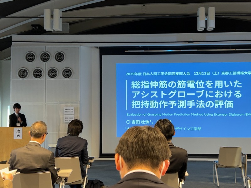2025年12月13日(土)に京都工芸繊維大学の松ヶ崎キャンパスで開催された「2025年度 日本人間工学会関西支部大会」で研究室の吉田君が発表を行いました。 発表のタイトルは「総指伸筋の筋電位を用いたアシストグローブにおける把持動作予測手法の評価」です。 前回の発表では把持動作に先立って起こる「手を開く動作」で発生する筋電位信号を用いた把持動作予測手法を提案しました。 今回の発表では、その手法を使ったアシストグローブの試作を行い、ユーザ評価実験でその有用性を確認した結果について発表をしました。 お昼、学食を期待したのですが、土曜日で開いていなかったため、近くのラーメン屋さんに行きました!(松ヶ崎キャンパス周辺はおいしいラーメン屋さんが多いらしいです)。