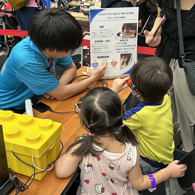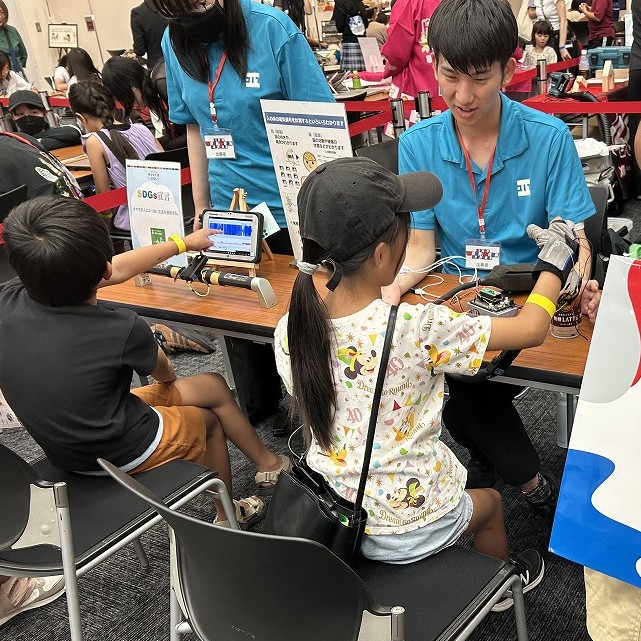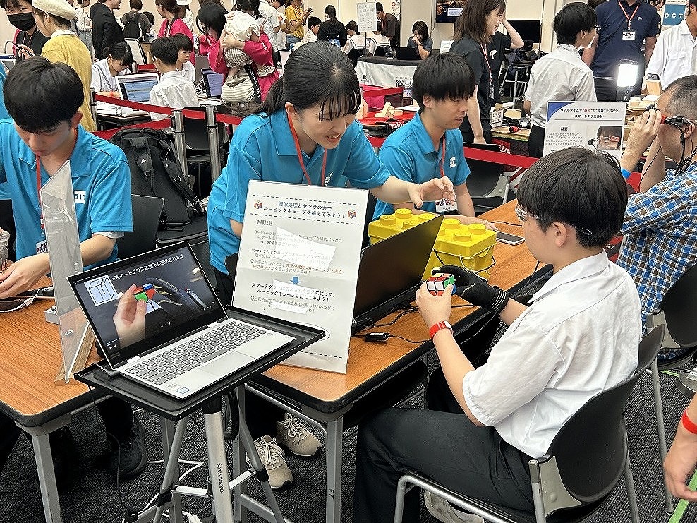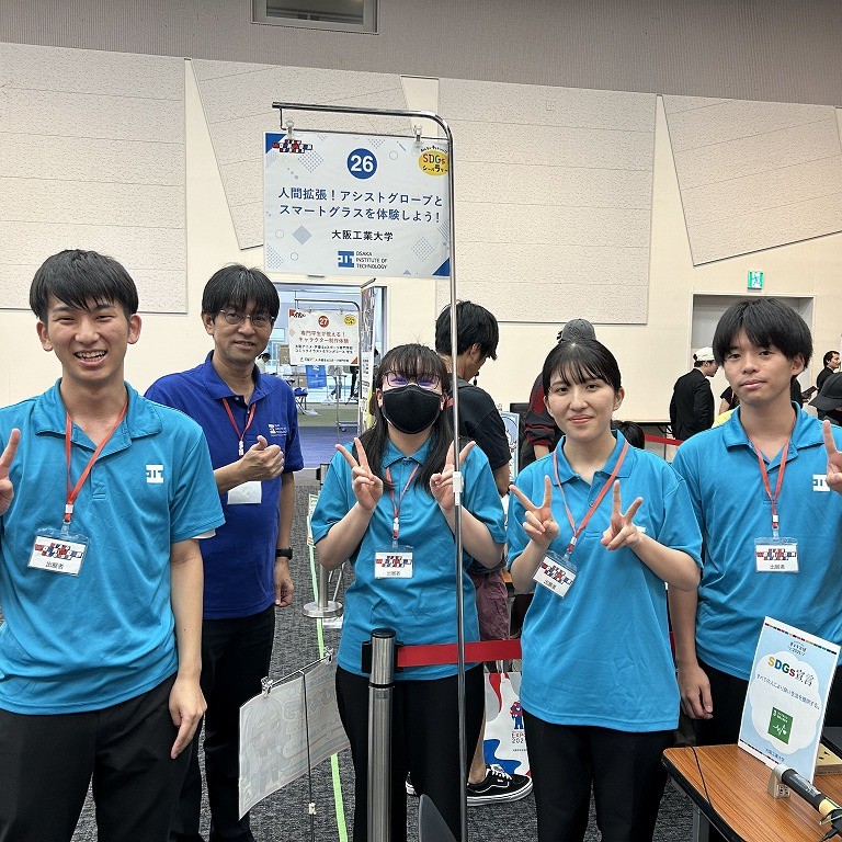 2025年9月20日、夢キタ万博2025「KITAKU WORK WORK EXPO 2025(北区ワクワクエキスポ)」にて、研究室メンバーと技術展示を行いました。 SDGs目標3「すべての人に健康と福祉を」のコーナーのひとつとして、 【人間拡張!アシストグローブとスマートグラスを体験しよう】 というタイトルで出展しました。 10時から16時までの展示時間中、お昼休憩をのぞいてほとんど途切れることなく、多くの方にデモを体験していただきました。特に小さなお子さんや中学生がたくさん参加してくれ、この体験をきっかけに工学に興味を持ってもらえたら嬉しいです。 展示だけでなく、搬入・準備とメンバーのみなさんおつかれさまでした~