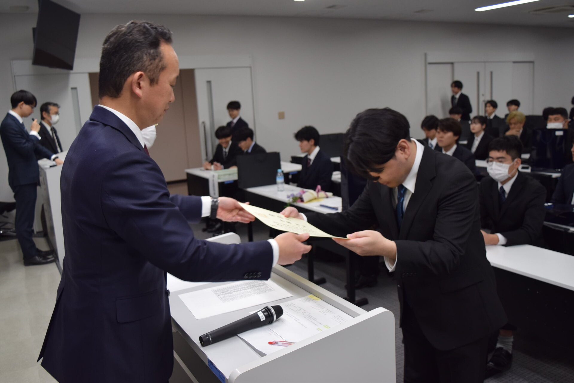 大阪工業大学の学位記授与式が総合体育館にて行われました。その後、教室にて電気電子システム工学科の学位記授与を行い、学部生104名、修士課程24名の計128名の卒業生・修了生一人ひとりに学位記が手渡され、4年間・2年間の学修の成果が証されました。