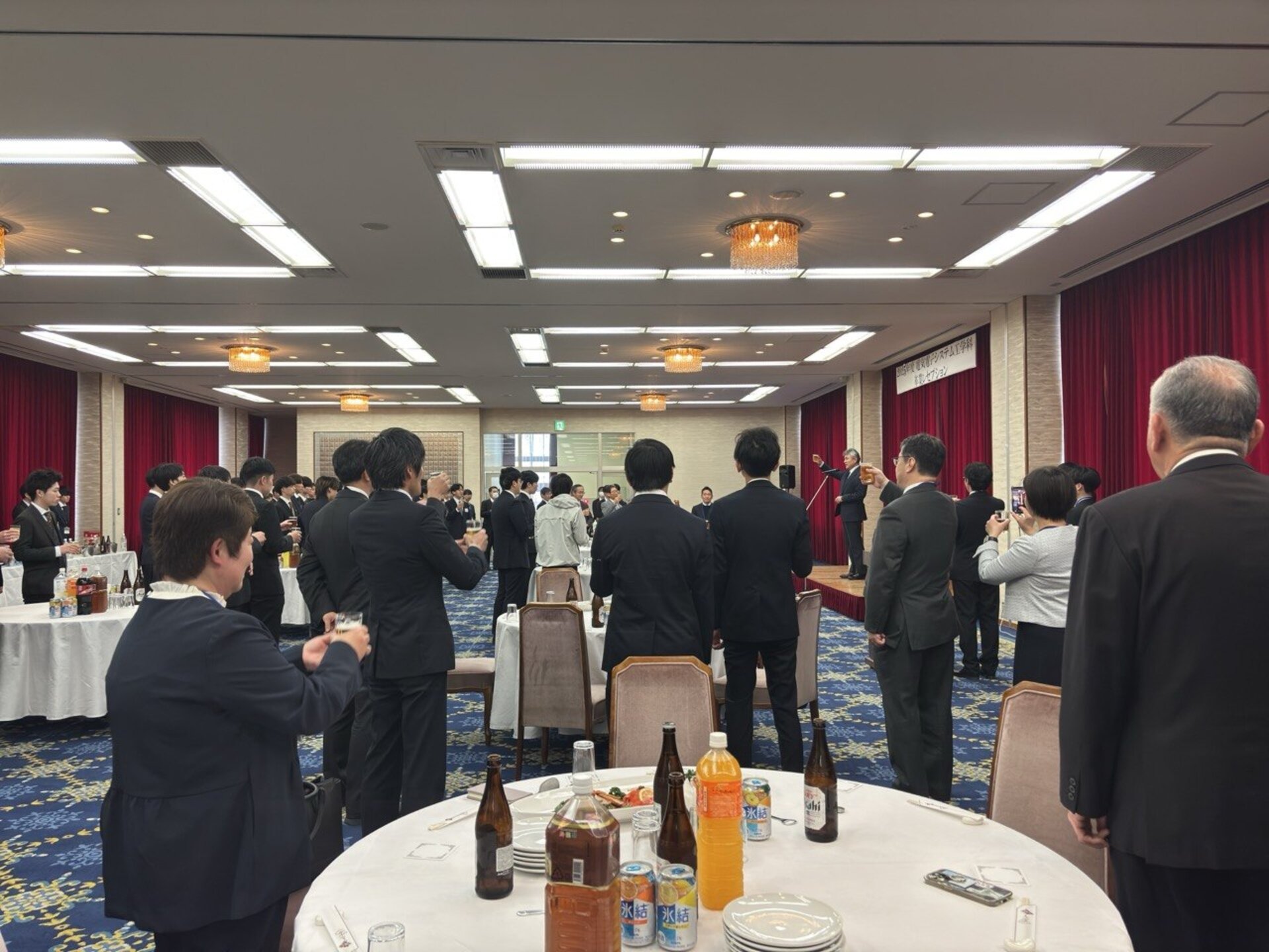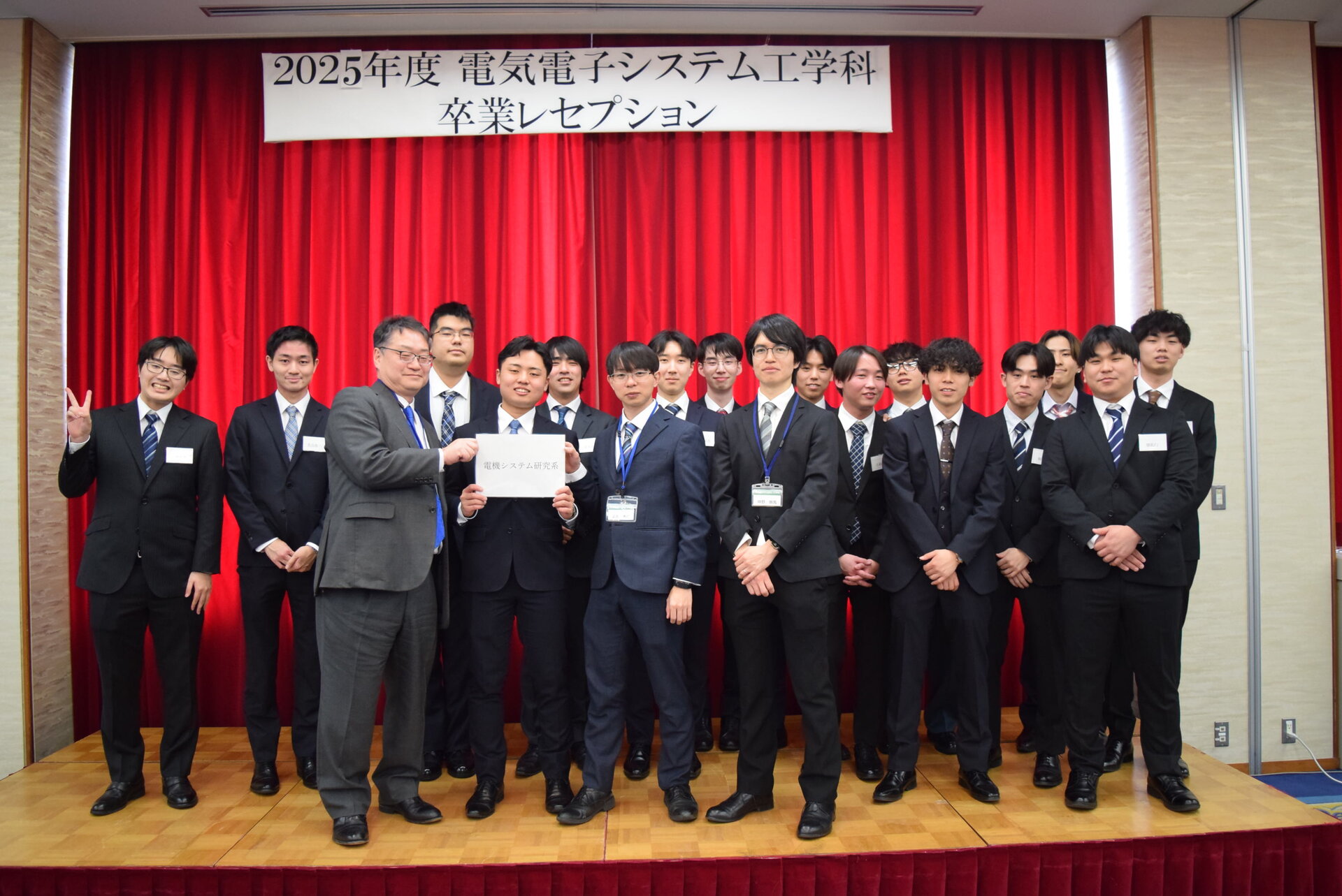 午後からは、電気電子システム工学科卒業レセプションを開催しました。82名の卒業生・修了生が参加し、ご多用の中ご臨席賜りましたご来賓の皆様方、並びに大阪工業大学後援会、大阪工業大学校友会、学科卒業生会、元学科教員の先生方よりお祝いをいただきました。レセプションでは、卒業生代表による挨拶、教員からの祝辞が行われ、卒業生同士の最後の語らいの場として、心温まる式典となりました。