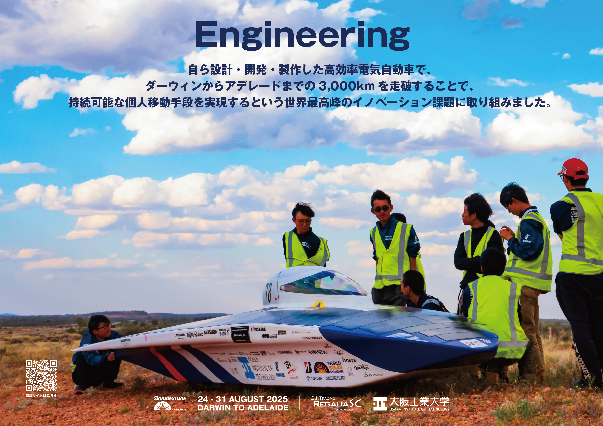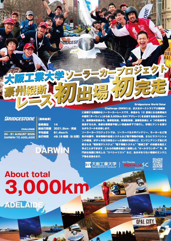 ソーラーカープロジェクトが、2025年10月20日~25日にオーストラリアで開催された世界最高峰のソーラーカーレース「Bridgestone World Solar Challenge 2025(BWSC)」のチャレンジャークラスに初出場し、見事完走を果たしました。本学科からは6名の学生がドライバーや電装班として参加し、チームの完走に大きく貢献しました。