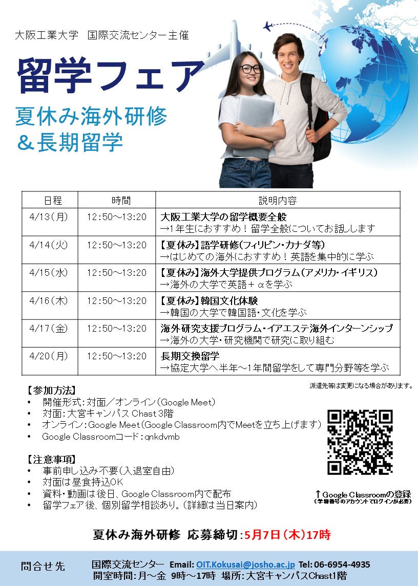 大阪工業大学の留学プログラム全般、夏休みの海外研修についての説明会を行います。