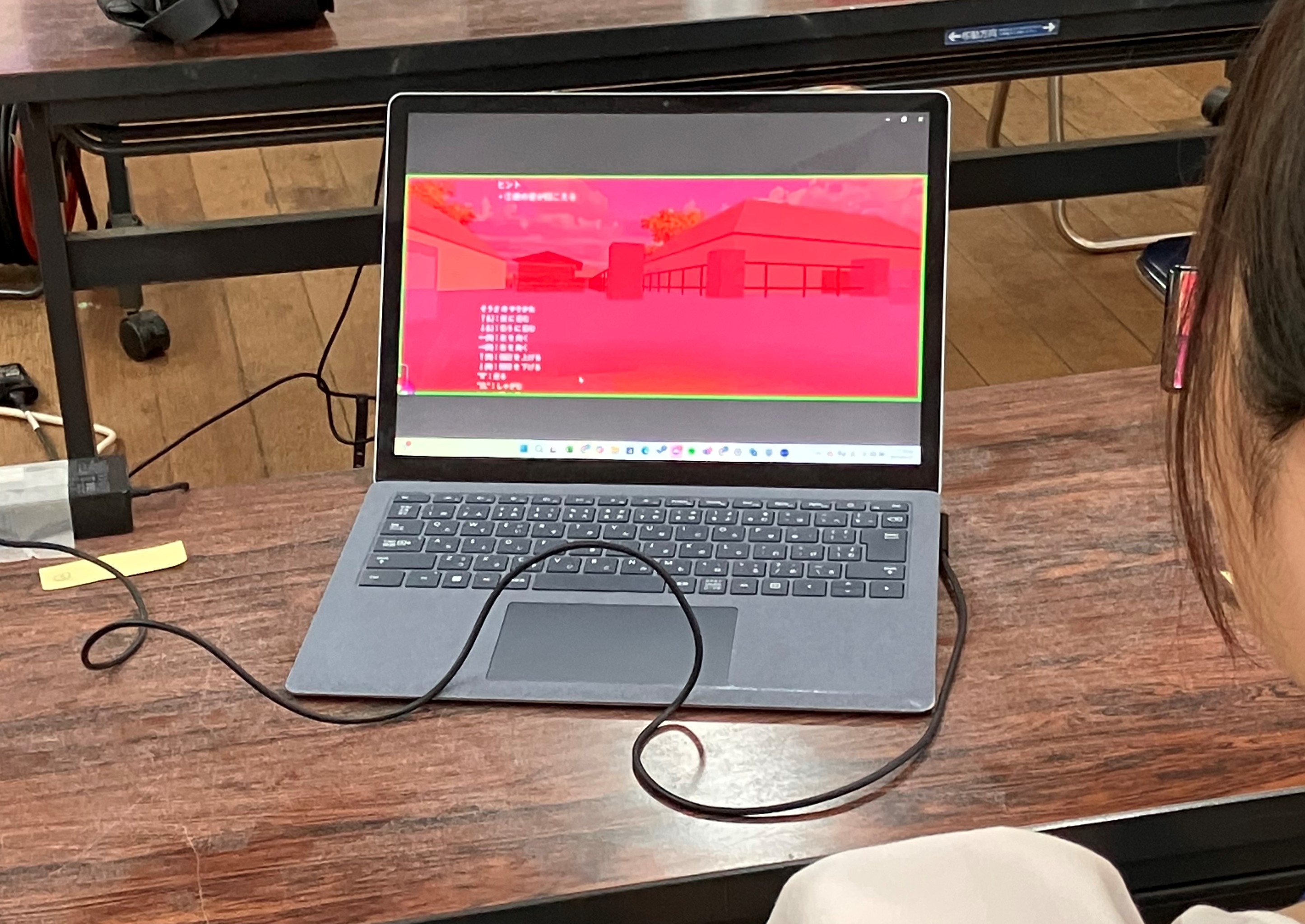 参加者は2人1組となり、1人がVRゴーグルを装着して操作し、もう1人がモニターを見ながら避難の助言を行う形式で進行しました。観光地ではスタンプラリーが実施されており、スタンプを集めている最中に地震が発生。倒木による通行止めや火災の発生、津波などが起こる中、避難を試みます。そして、避難行動が点数化され、振り返ることで学びを深めていただきます。学生は操作方法や振り返りポイントについてサポートし、参加者は時間内に4~5回の体験を通じ、防災意識を高めていきました。