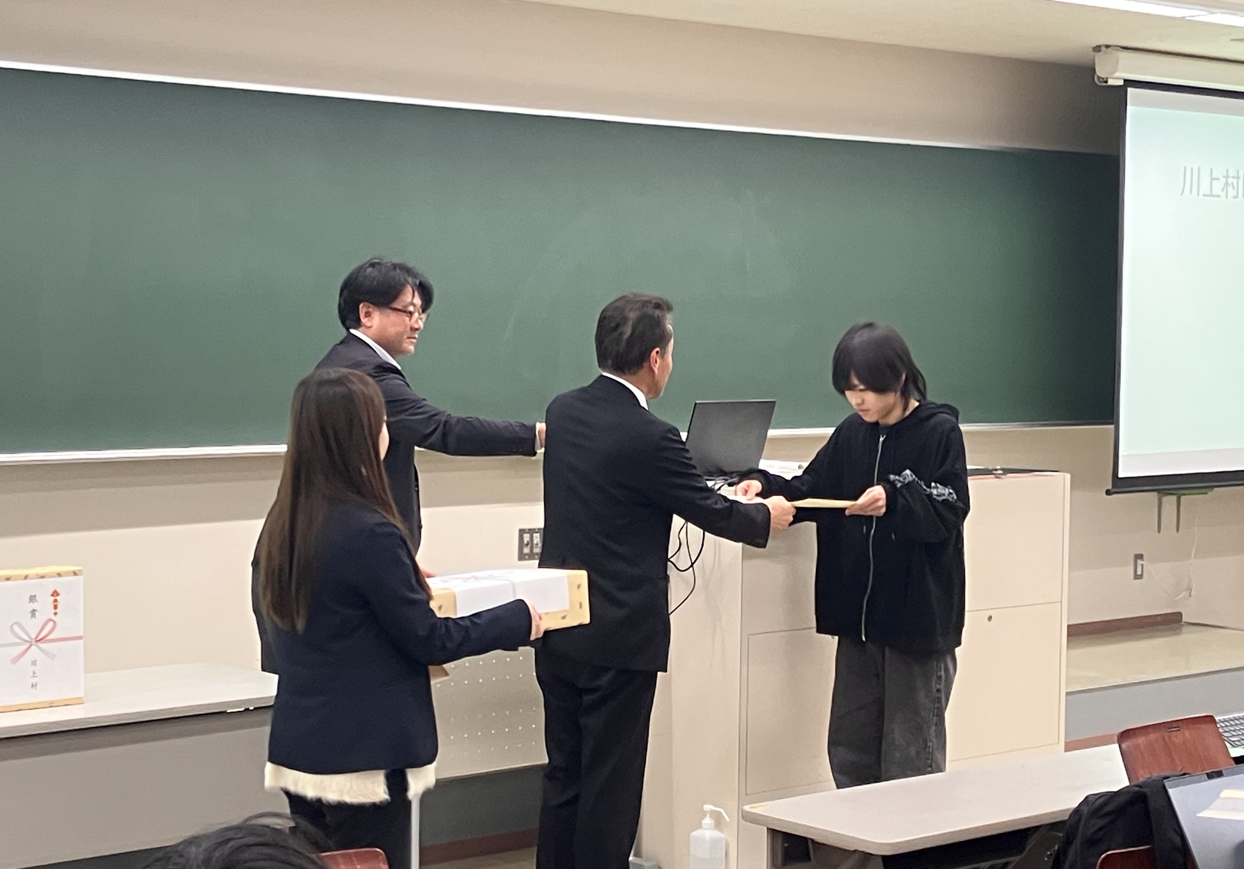1月13日(火)、情報メディア学科3年生が制作した奈良県川上村をPRする動画コンテンツの優秀作品の表彰式を枚方キャンパスで実施しました。表彰式には、本学と連携協定を締結している同村の泉谷隆夫村長をはじめ、村の関係者、学生、教職員など約110名が出席しました。