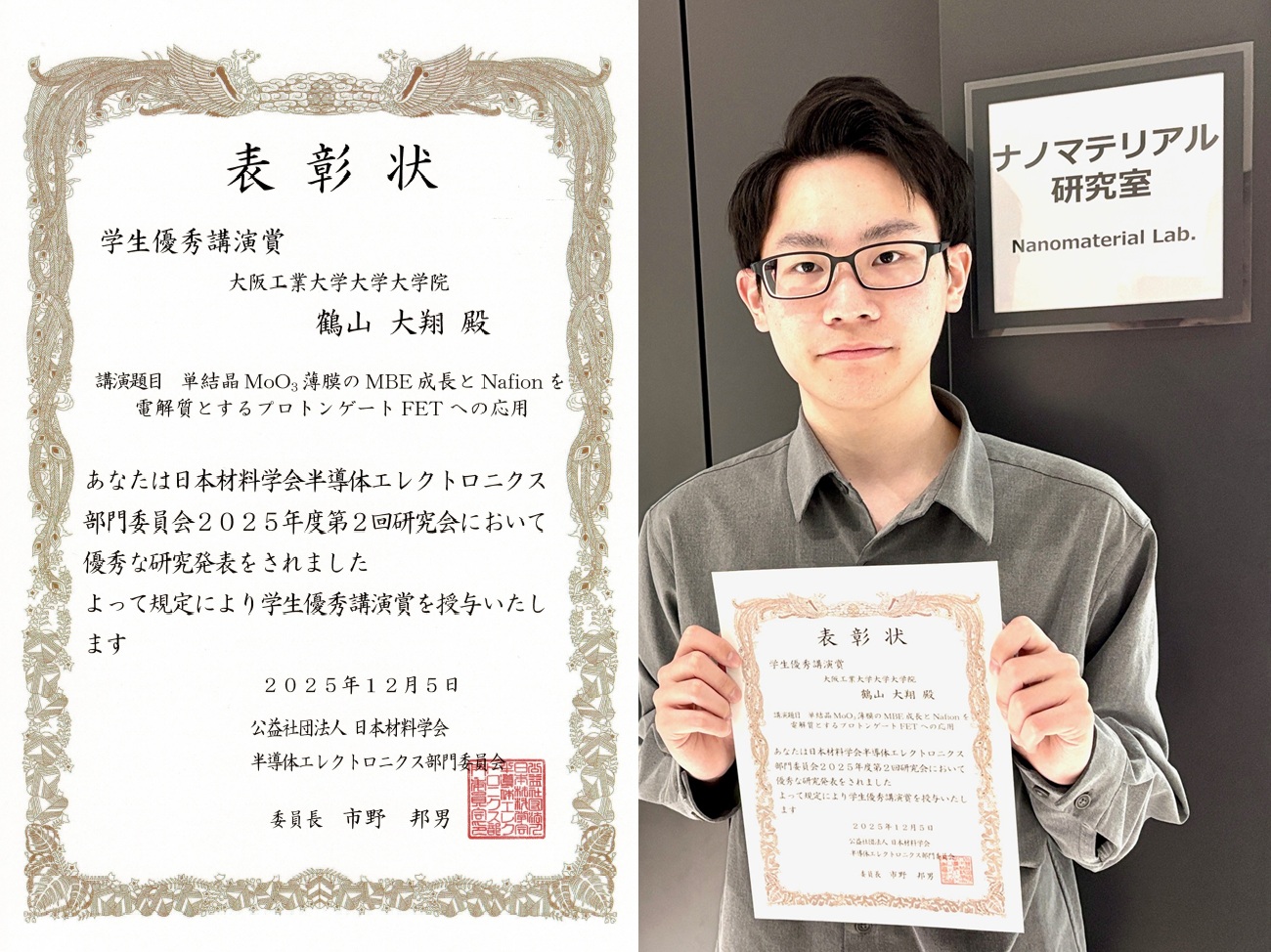 2025年11月29日(土)に京都工芸繊維大学で日本材料学会 半導体エレクトロニクス部門委員会 第2回研究会とナノ材料部門委員会 第1回研究会が合同開催され,EDM専攻電気電子工学コース修士課程2年生の鶴山大翔さんが口頭発表し、学生優秀講演賞を受賞しました。