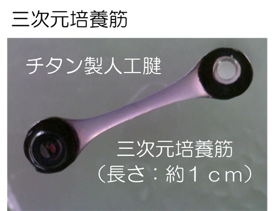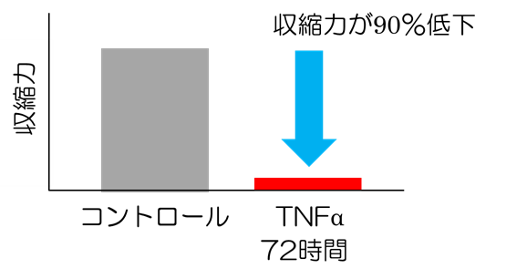 コラーゲン中で立体的に培養し、人工腱で固定した三次元培養筋は、電気刺激により実際に収縮する。炎症性物質 TNF-αの作用により、収縮力は著しく低下する(約90%低下)。