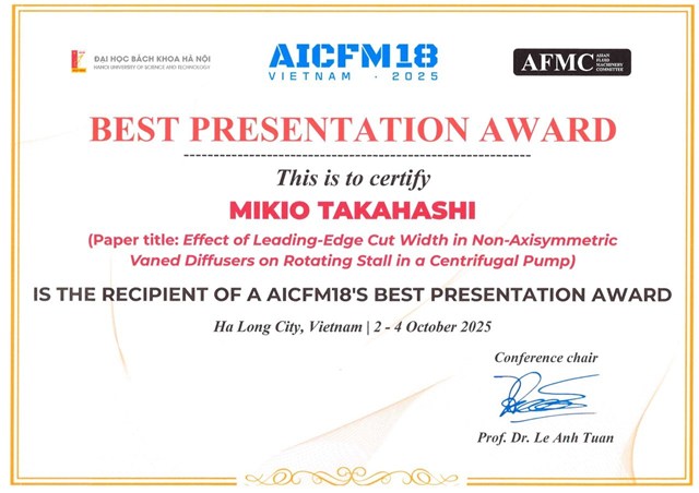 2025年10月2日〜4日にHa Long, Vietnamで開催された「AICFM18 (The 18th Asian International Conference on Fluid Machinery)」(主催:Asian Fluid Machinery Committeeおよび Hanoi University of Science and Technology)において口頭発表を行い、優れた研究発表としてBest Presentation Awardを受賞しました.