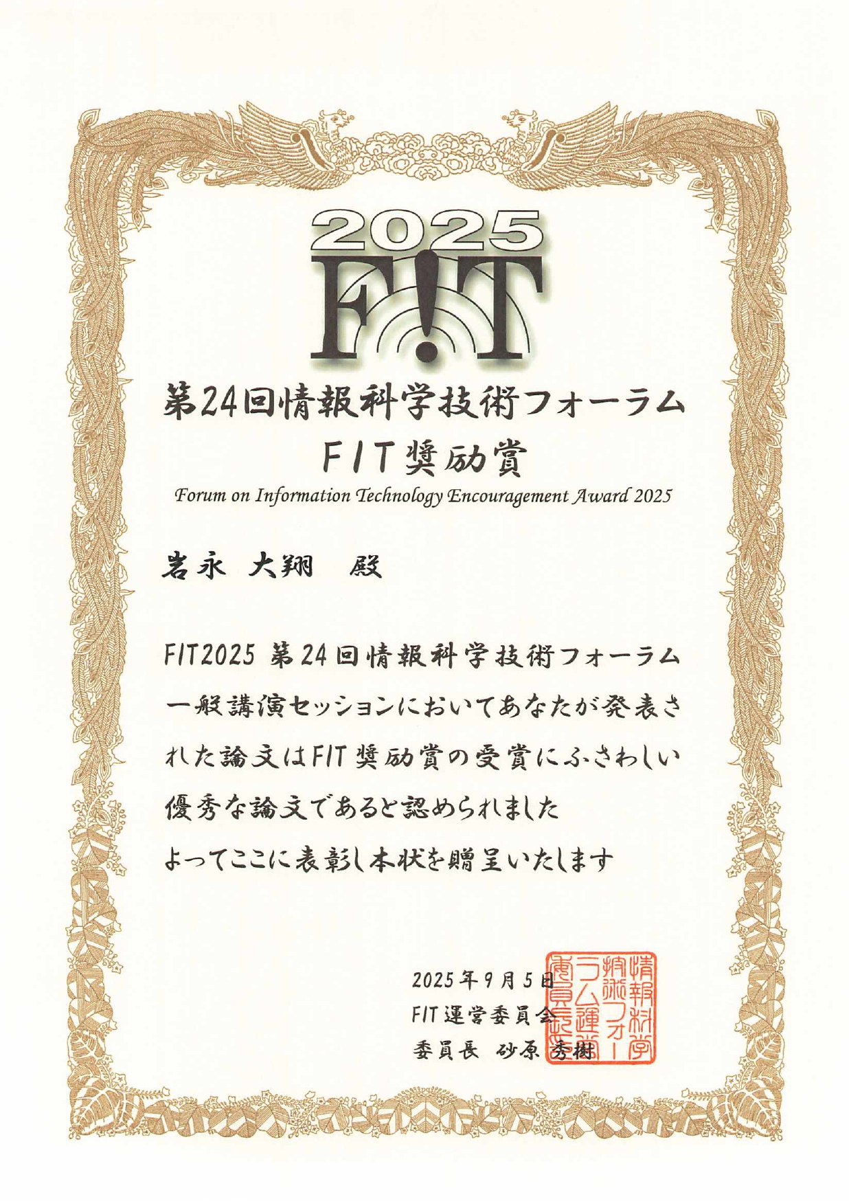「第24回情報科学技術フォーラム(FIT2025)」(主催:一般社団法人電子情報通信学会、情報・システムソサイエティ(ISS)、ヒューマンコミュニケーショングループ(HCG))で発表した演題「SoC FPGAに向けたYOLOX_sモデルの量子化と精度比較」の発表が優秀であると認められ「奨励賞」を受賞しました。(2025年9月5日)