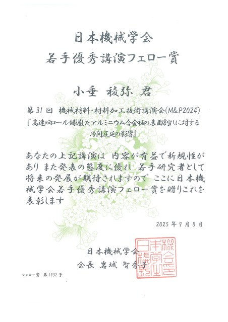 第31回機械材料・材料加工技術講演会(M&P2024)(主催:日本機械学会)において発表した演題「高速双ロール鋳造したアルミニウム合金板の表面割れに対する冷間圧延の影響」の講演が優秀であると認められ、「若手優秀講演フェロー賞」を受賞しました。(2025年9月8日)