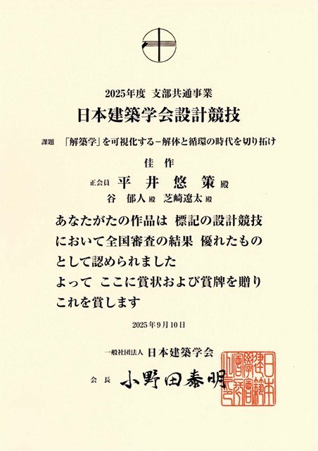 一般社団法人日本建築学会が主催する「2025年度支部共通事業 日本建築学会設計競技」において、本学ロボティクス&デザイン工学研究科の学生が応募した設計作品「いのちのちに」が評価され、佳作を受賞しました。(2025年9月10日)