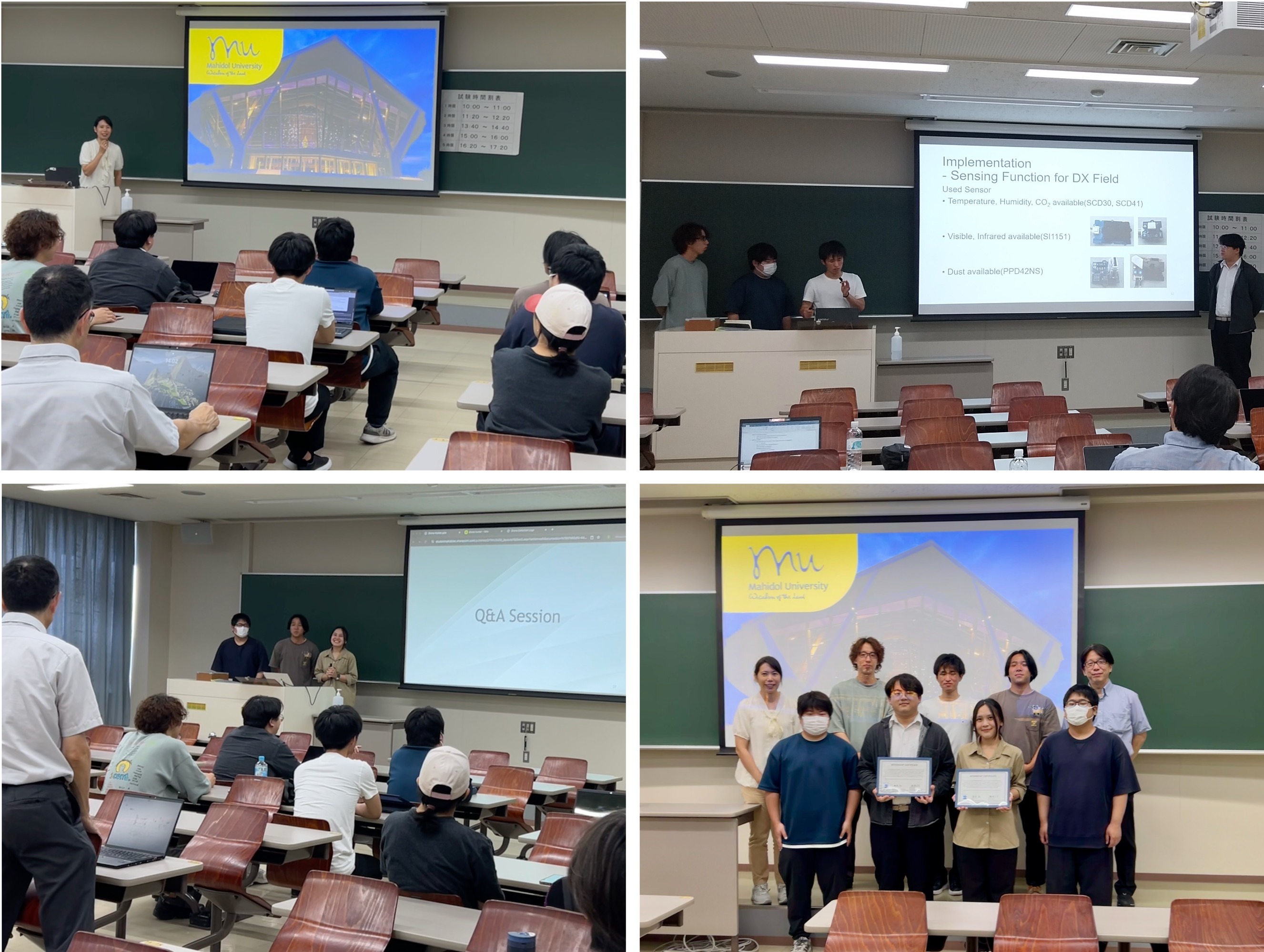 2025年7月29日の成果報告会では、開発内容や結果をすべて英語で発表しました。マヒドン大学の教員も来学し、専門的な質疑応答が行われました。