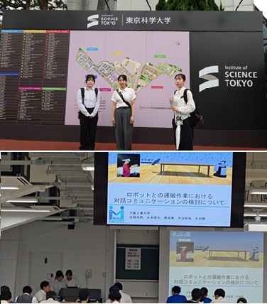 続く9月3日~5日には、東京科学大学で開催された第43回日本ロボット学会学術講演会 (RSJ2025) に参加。ロボカッププロジェクトの成果として、「ロボットとの運搬作業における対話コミュニケーションの検討について」という題目で、当研究室の辻岡 光莉さん、原 光希さん、宇治 伶奈さんが発表を行いました。