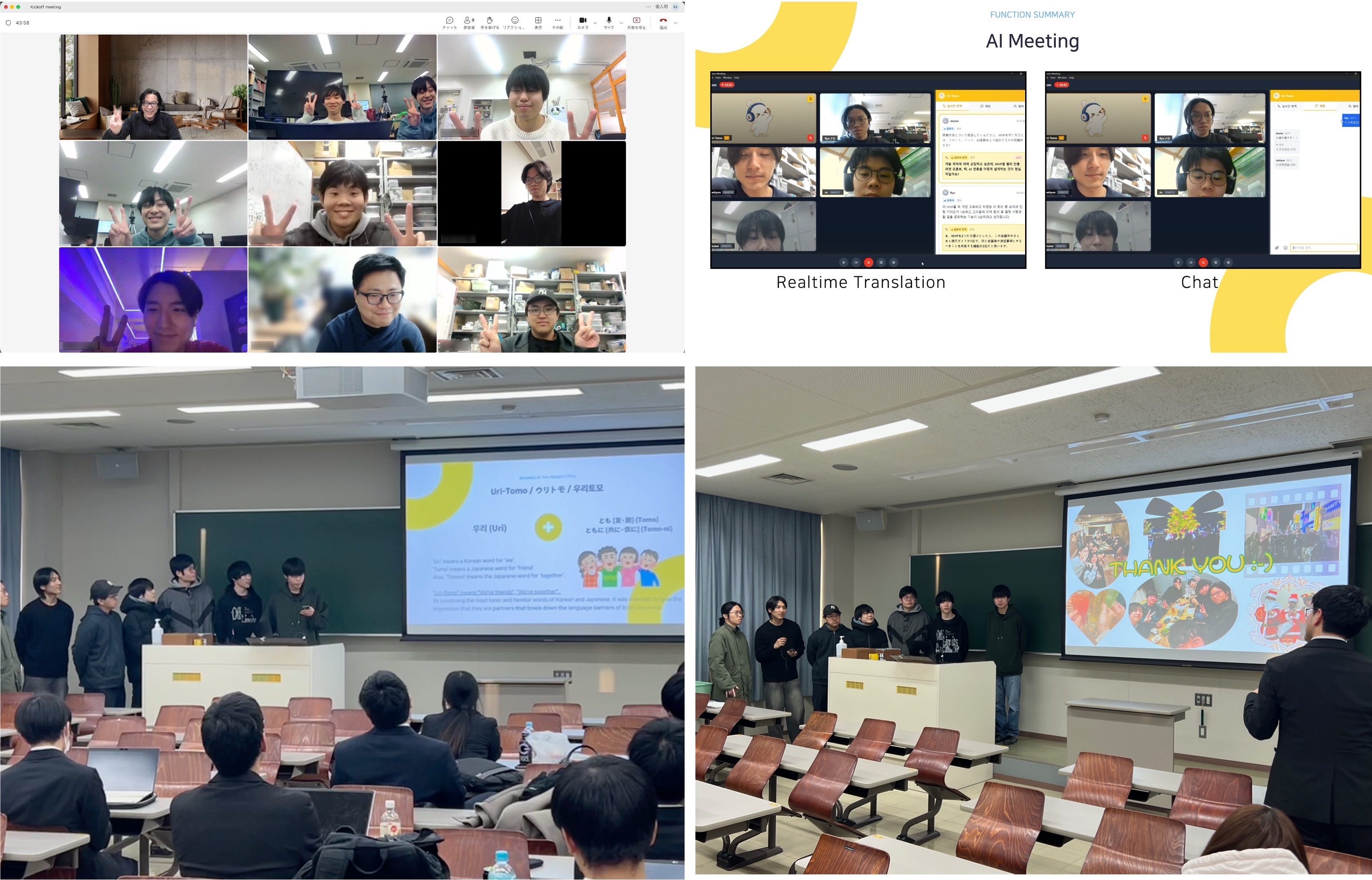 前半1か月はオンラインで活動し、学生同士が自ら連絡を取り合いながら、どのような仕組みを構想するかを議論しました。また、毎週、Microsoft Teamsを用いて、日韓両国の教員への毎週の英語による進捗報告を通じて検討を重ねました。後半はカチョン大学の学生2名が本学に滞在し、各自が自国語で話すと相手言語へ自動的にテキスト翻訳され表示される機能や、会議中に要点整理やアイデア提案を行うAIエージェント機能を取り入れたシステムを開発しました。最終成果報告会では、その成果を発表しました。