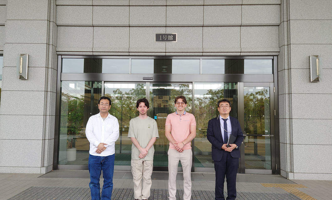 枚方キャンパスに来学された2人と担当教員(左から宮脇教授、Marcos FERRANDO ESPAÑAさん、Aymeric DUCHÊNEさん、荒木教授)