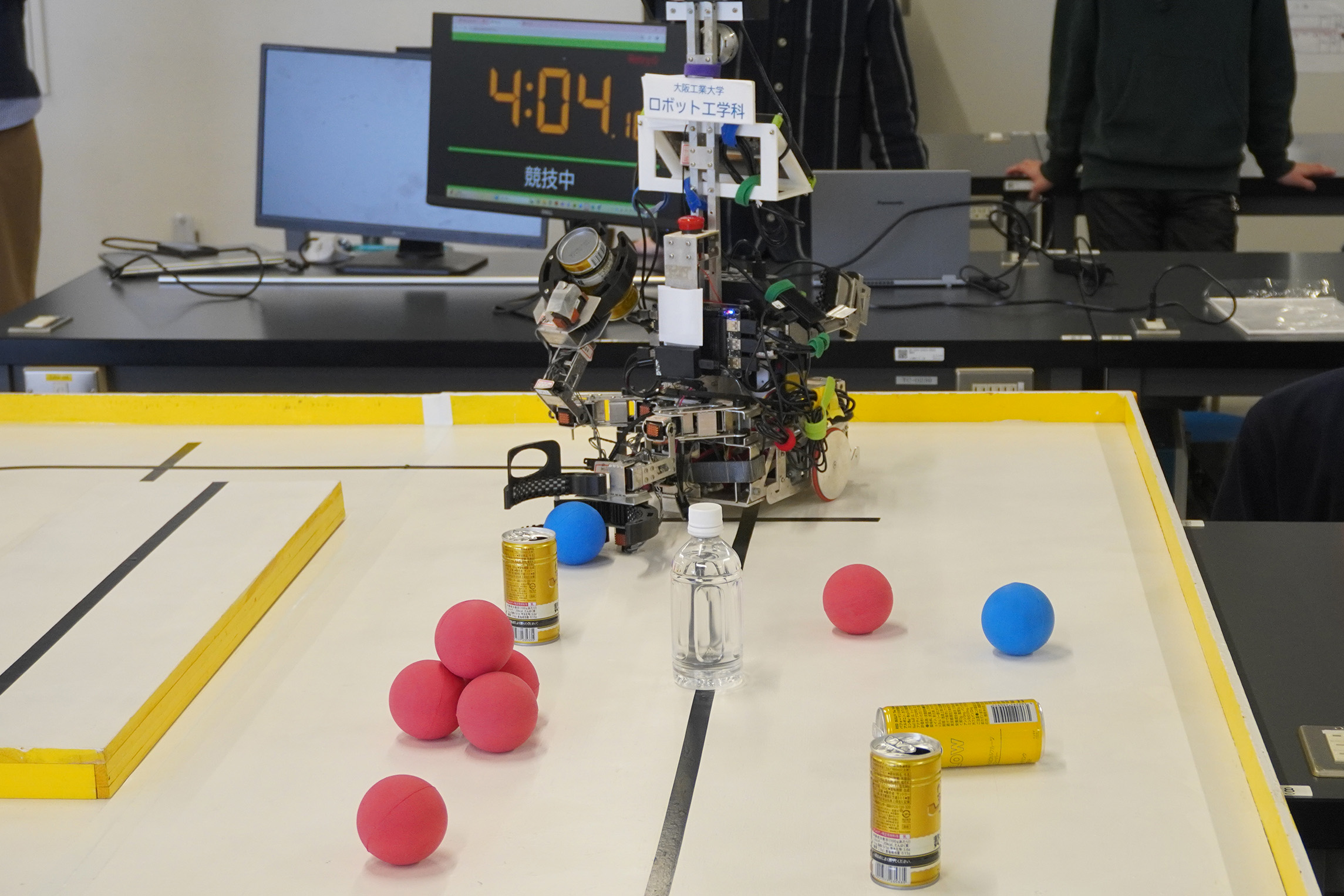 競技は、スタート時を除き人為的な操作を加えないロボットを用いて、指定されたフィールド上で決められた作業を所定時間内で行い、得点を競います。単純な作業が中心のチャレンジャーズコースと異種形状を正確に扱うことが求められるマスターズコースに分かれて行われ、本学のチームはマスターズコースに出場しました。