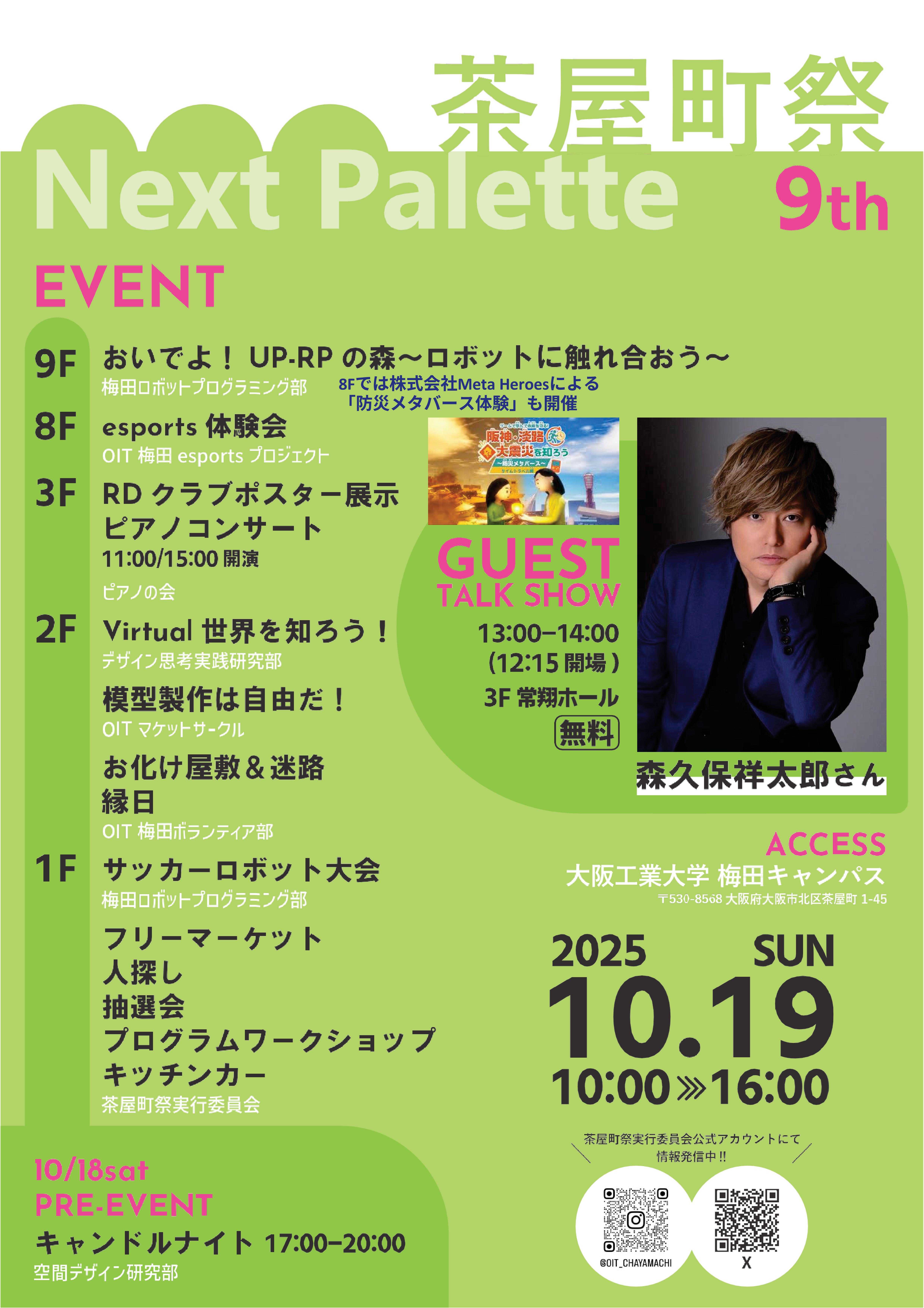梅田キャンパスに所属するプロジェクトや課外活動団体からの出展に加え、人気声優・森久保祥太郎氏によるトークショー(無料)を開催します。