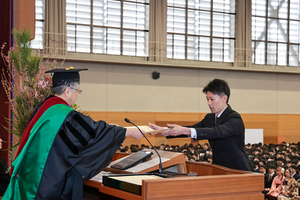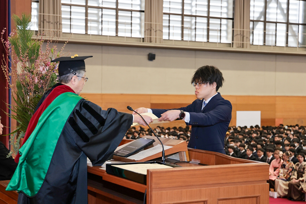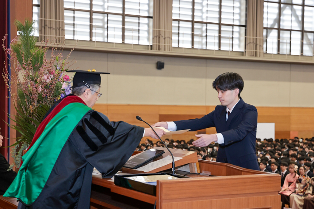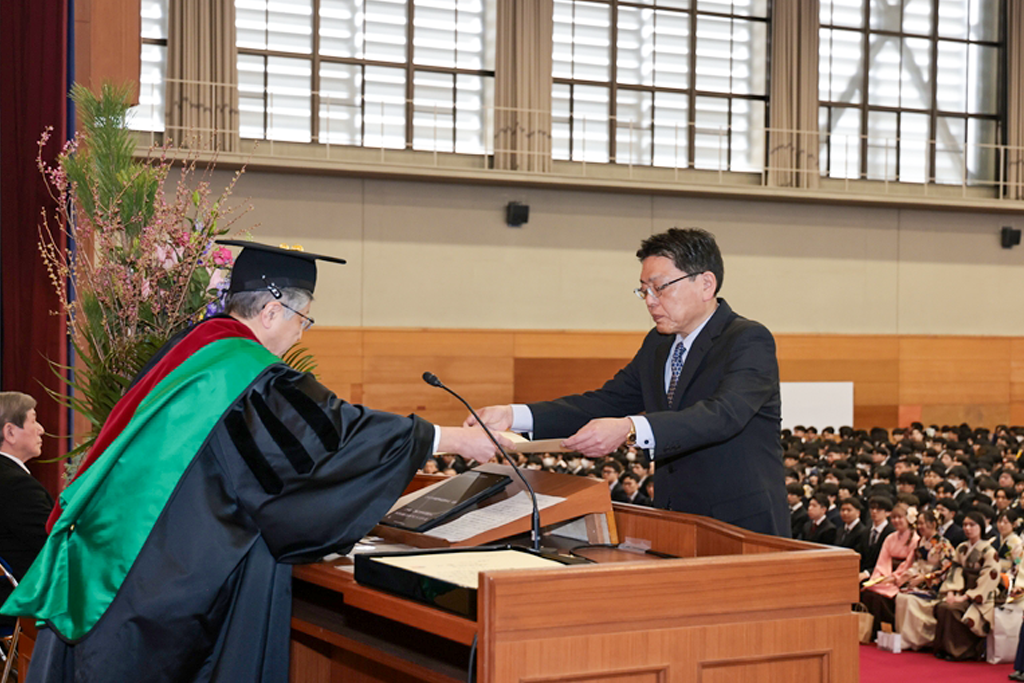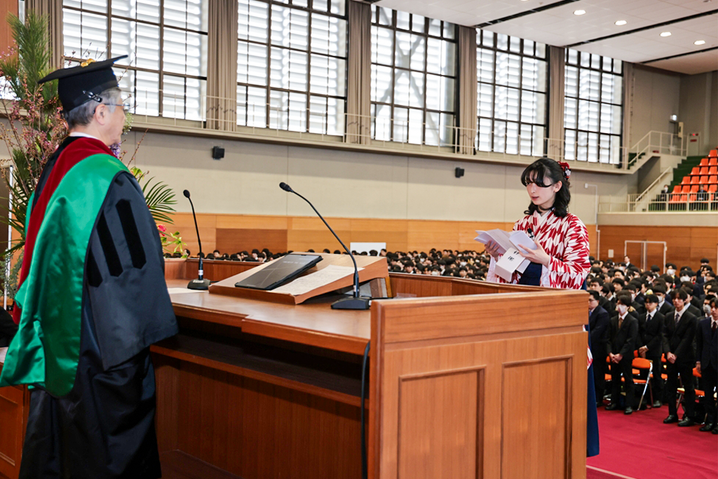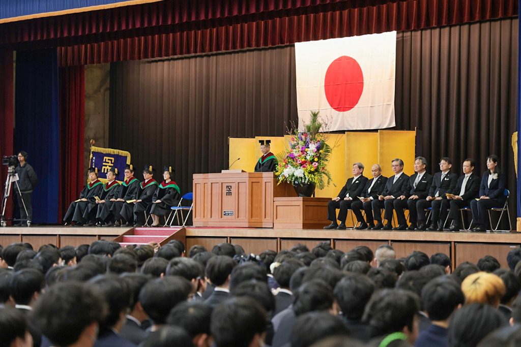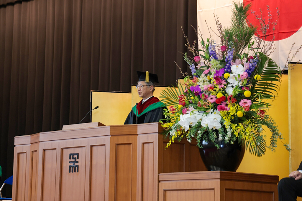 井上晋学長は、式辞の中で「学修や研究活動に注力されるとともに、さまざまな経験を積み重ねてこの日を迎えられましたことに対し深く敬意を表します。同時に、それを支えていただいたご家族や関係各位に是非とも感謝の意を伝えていただきたいと思います。近年は、世界のさまざまな地域で人々の命や生活を脅かす紛争が起きています。また、我が国に目を向ければ、物価の高騰や人口減少といった状況が深刻化しており、日本を含む世界の情勢は時々刻々と変化しています。将来に不安を感じる方も多いかもしれませんが、学生生活を通じて得られた、自身の行動規範がぶれない心の強さと、臨機応変に物事を考える心のしなやかさ、をもって事にあたるよう心掛けてください。本学で学んだことに誇りを持ち、新しいことにチャレンジし続ける姿勢を大切にしてください。健康にはくれぐれも気を付けられますとともに、伝統ある本学の遺伝子をもつ卒業生・修了生として、限界を超える成長を遂げられますことを教職員一同祈念しておりますことをお伝えし、学長式辞といたします」とはなむけと激励の言葉を贈りました。