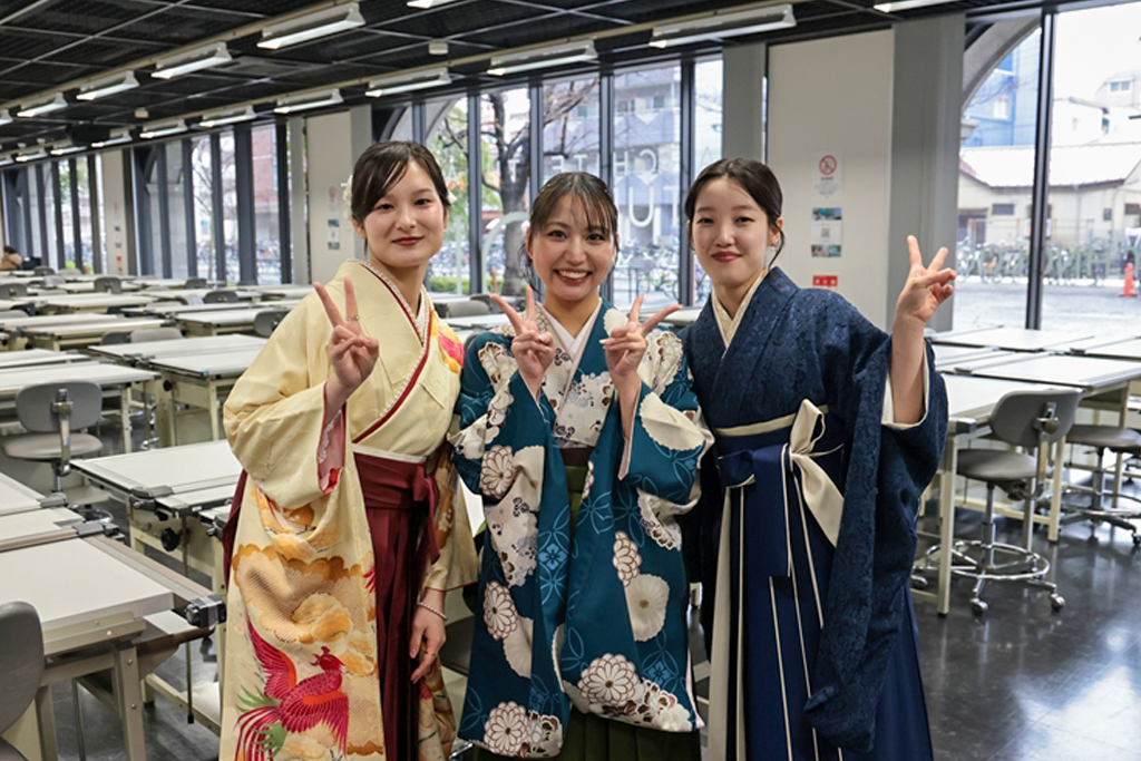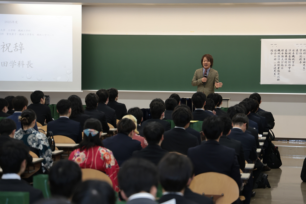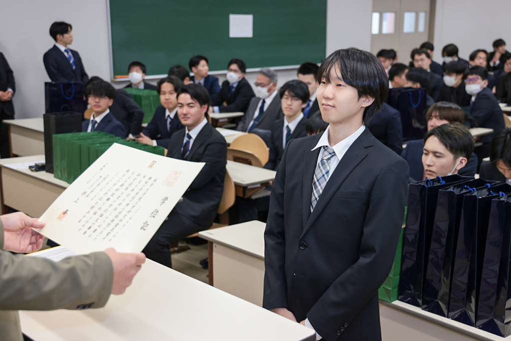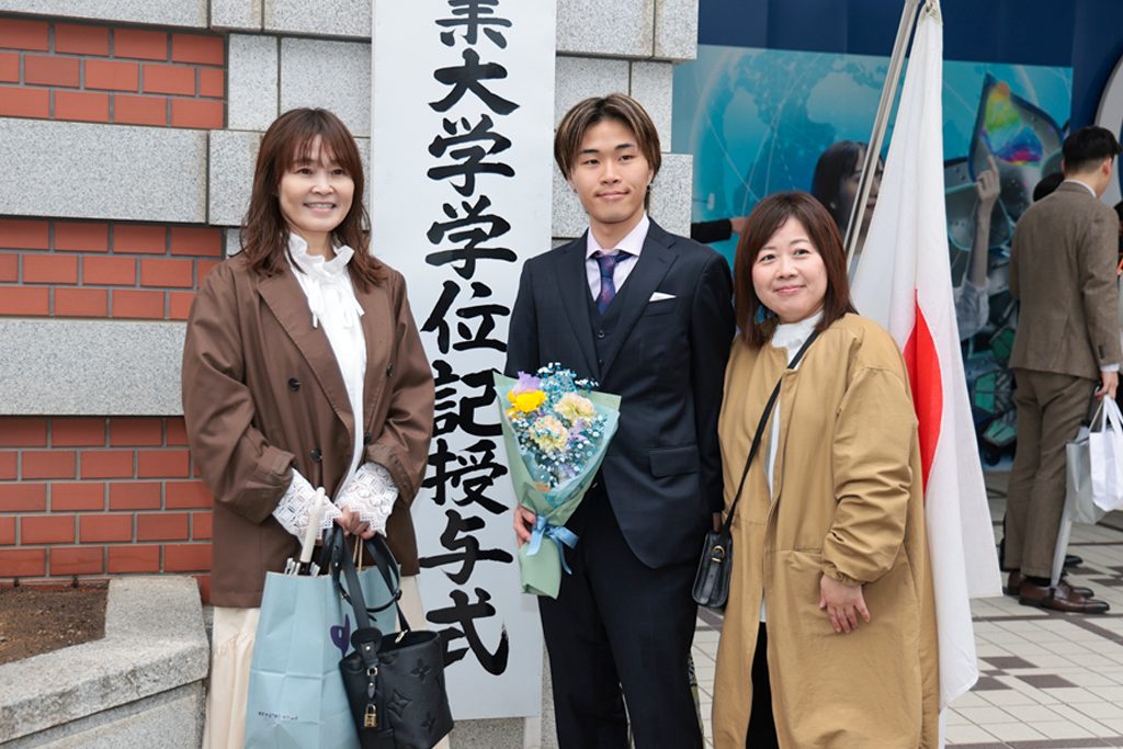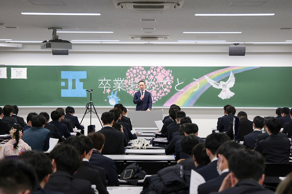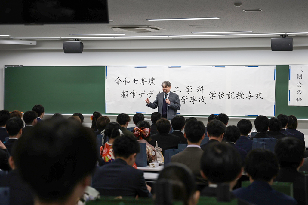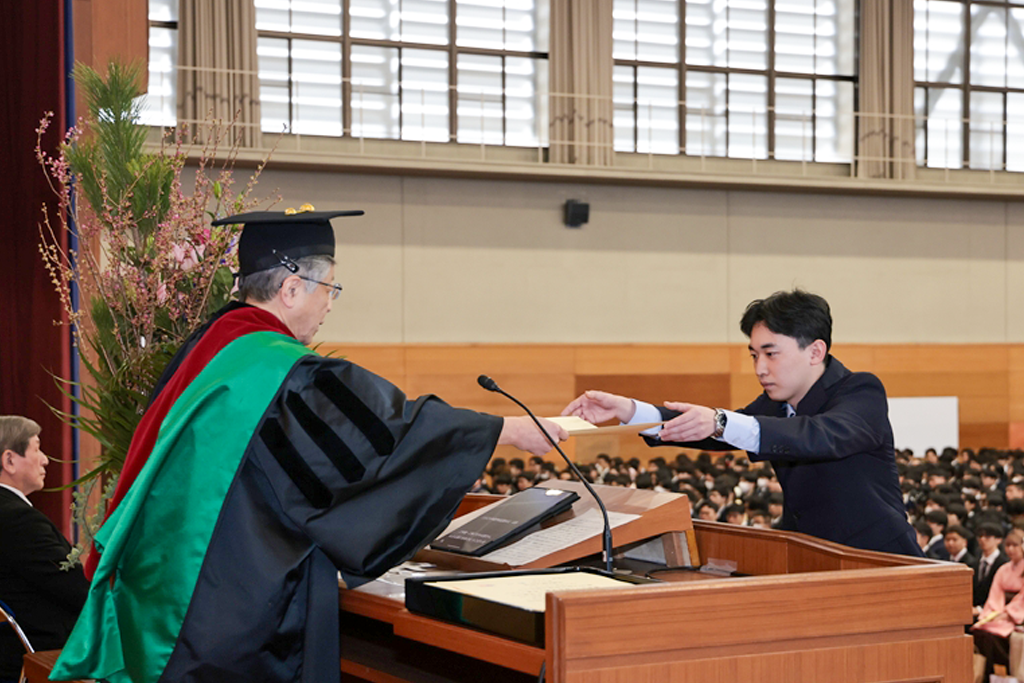 井上晋学長は、式辞の中で「学修や研究活動に注力されるとともに、さまざまな経験を積み重ねてこの日を迎えられましたことに対し深く敬意を表します。同時に、それを支えていただいたご家族や関係各位に是非とも感謝の意を伝えていただきたいと思います。近年は、世界のさまざまな地域で人々の命や生活を脅かす紛争が起きています。また、我が国に目を向ければ、物価の高騰や人口減少といった状況が深刻化しており、日本を含む世界の情勢は時々刻々と変化しています。将来に不安を感じる方も多いかもしれませんが、学生生活を通じて得られた、自身の行動規範がぶれない心の強さと、臨機応変に物事を考える心のしなやかさ、をもって事にあたるよう心掛けてください。本学で学んだことに誇りを持ち、新しいことにチャレンジし続ける姿勢を大切にしてください。健康にはくれぐれも気を付けられますとともに、伝統ある本学の遺伝子をもつ卒業生・修了生として、限界を超える成長を遂げられますことを教職員一同祈念しておりますことをお伝えし、学長式辞といたします」とはなむけと激励の言葉を贈りました。