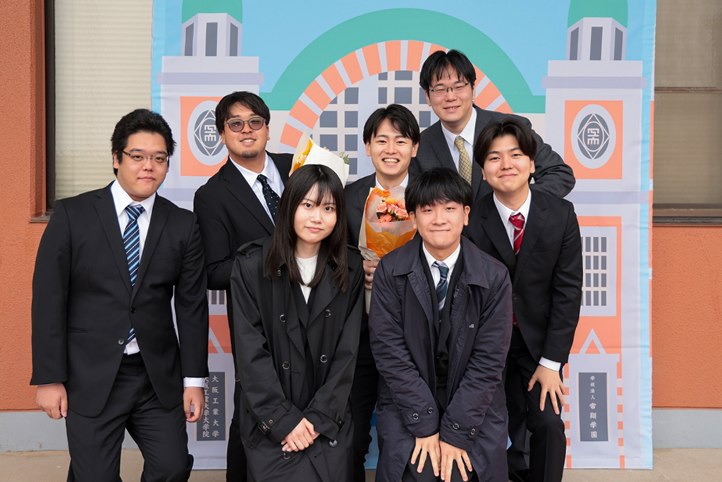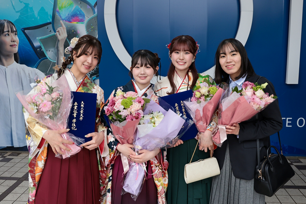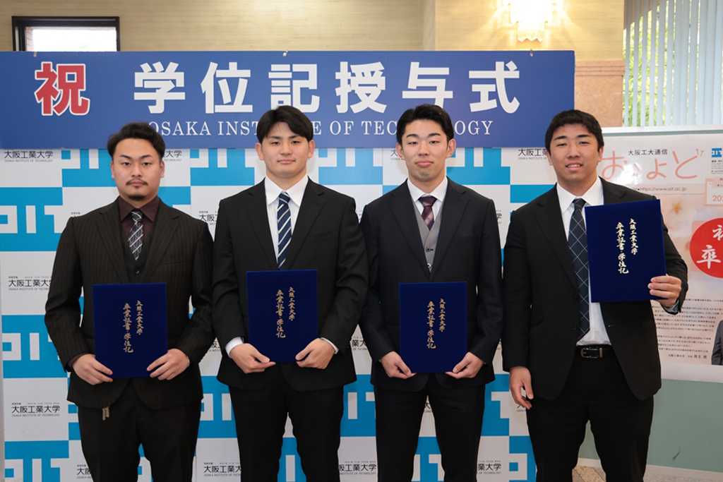 また、修了生・卒業生の総代としてロボティクス&デザイン工学部システムデザイン工学科の眞武永遠さんが、「4年前の春、大きな期待と少しの緊張を胸に、大阪工業大学に入学しました。入学前からの友人は少なく、新たな環境に戸惑ったことを覚えています。大学生活に慣れるにつれ学友が増え、授業や研究を一緒に頑張れたことを嬉しく思います。私の所属するシステムデザイン工学科では、システムを開発する上で必要なソフトウェアとハードウェアについて学びました。特に、ソフトウェアにおいては1年生から、プログラムの書き方や考え方について深く学ぶことができました。他にも、機電気系・システム系・IOTものづくり系といった幅広い内容を身につけられました。3年生の授業では、平常時でも使えるインクルーシブ防災を支援するアプリの開発をチームで行いました。それまで触れてきたことのないフレームワークでの開発に苦戦しましたが、完成したものを世界防災フォーラムで発表することができました。これらは大阪工業大学に在学していたからこそできた、貴重な経験であると確信しています。私たちは今日からそれぞれの道を進むことになりますが、大阪工業大学で培った知識と経験は仕事面・研究面はもとより、日常生活でも活かせるものです。この先で直面することもあるであろう困難を乗り越え、これからの人生を楽しみたいと思います。最後になりますが、素敵な学びの場を作り、ご指導くださいました先生方、ならびに職員の皆様、ともに悩んで励ましあった友人、そして、支えてくれた家族に心より感謝申し上げます。有意義な大学生活を送らせていただいた、この大阪工業大学のますますのご発展を祈念いたしまして、謝辞とさせていただきます」と謝辞を述べました。