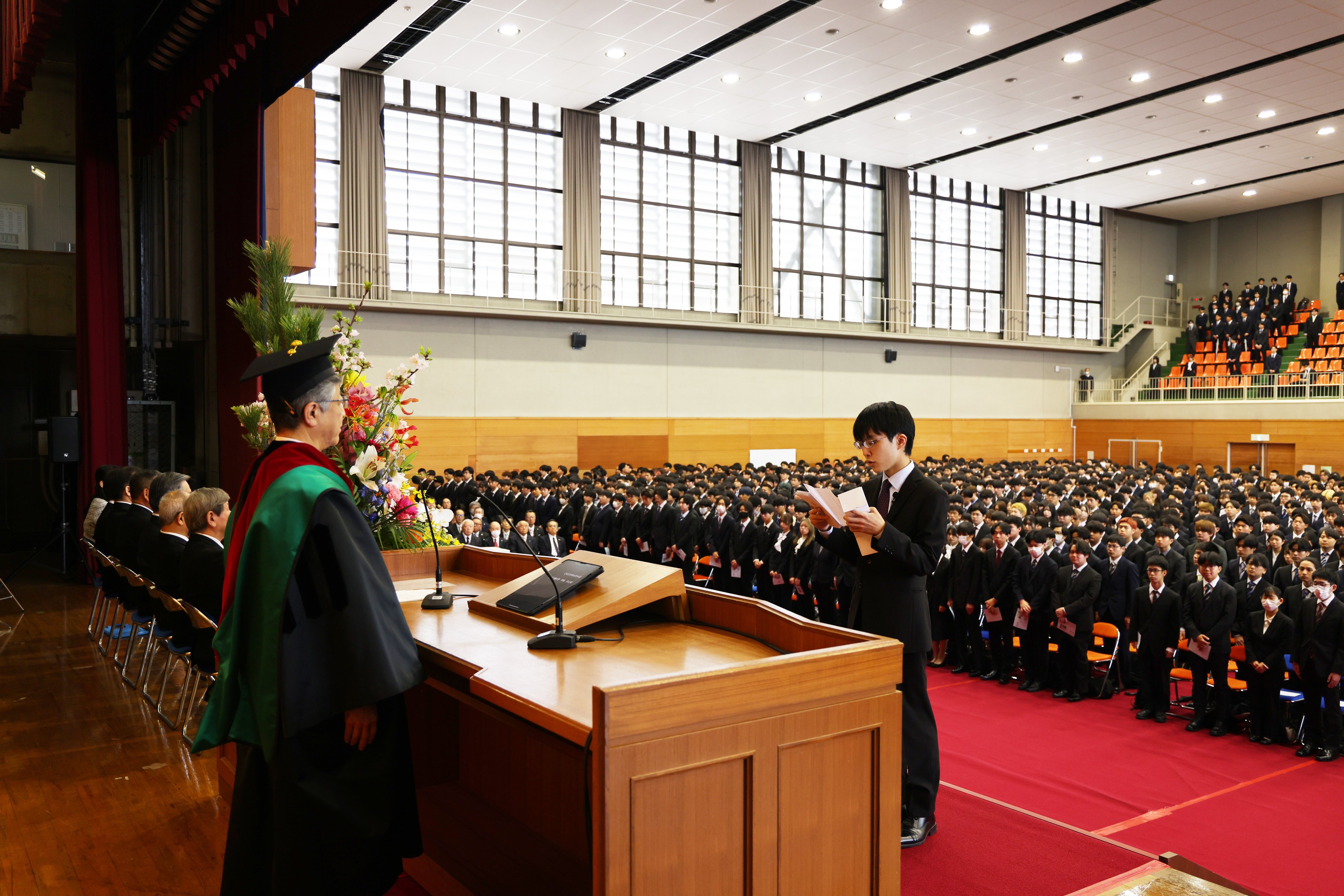 井上晋学長は式辞の中で、「卒業までの期間をどのように過ごすかは皆さん次第です。夢や目標を実現するためには、どのような知識や能力を身に付け、行動すべきかを考え、実行に移す姿勢が大切です。学生生活の中で身に付けた知識と経験は必ず将来の自分に役立つことを念頭に置いて学生生活を送ってください。」とエールを送りました。