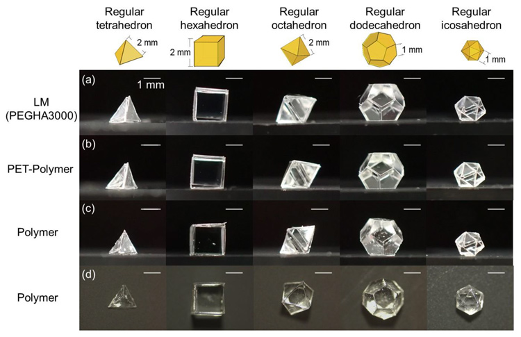 正多面体のゲル粒子。1~2ミリメートルの大きさで、水を吸うと形が崩れることなく膨らむ