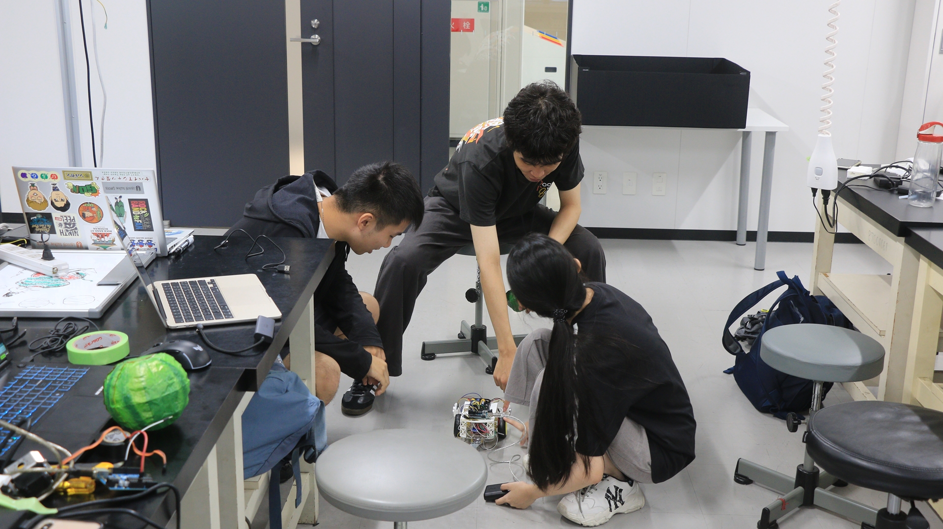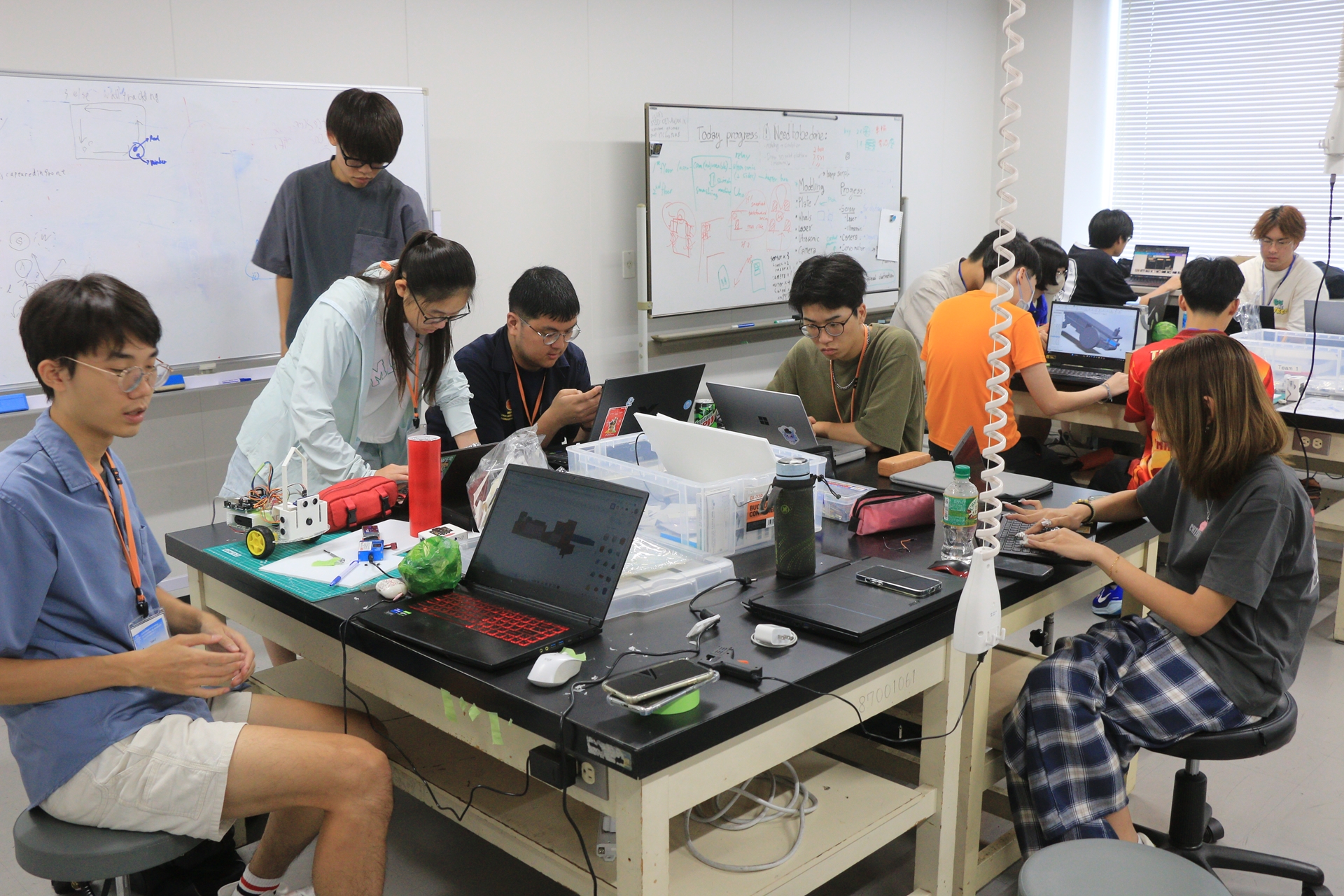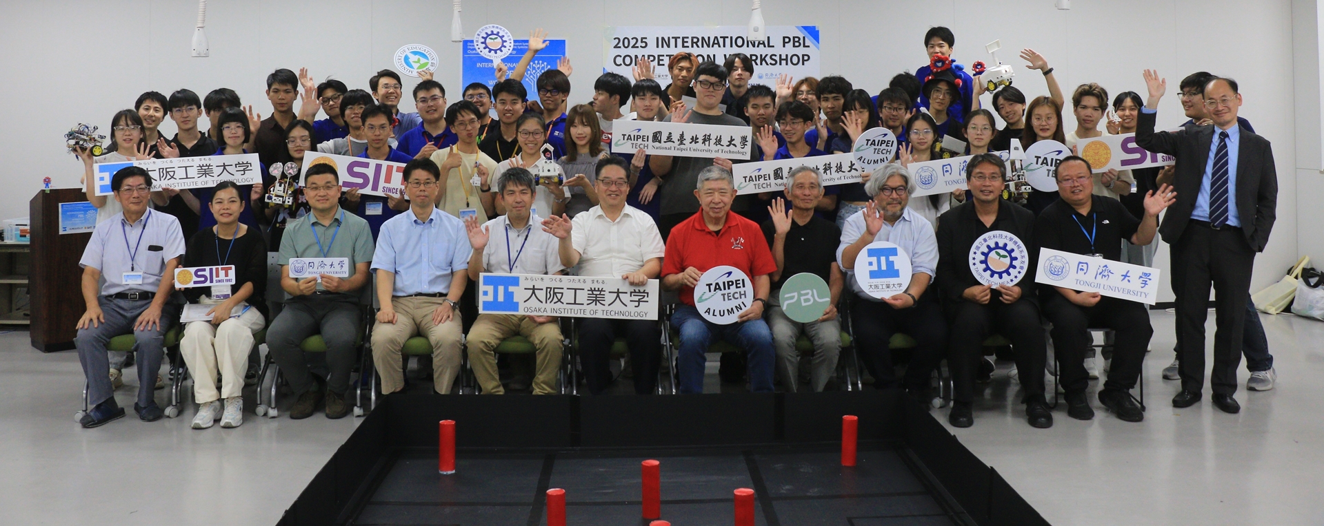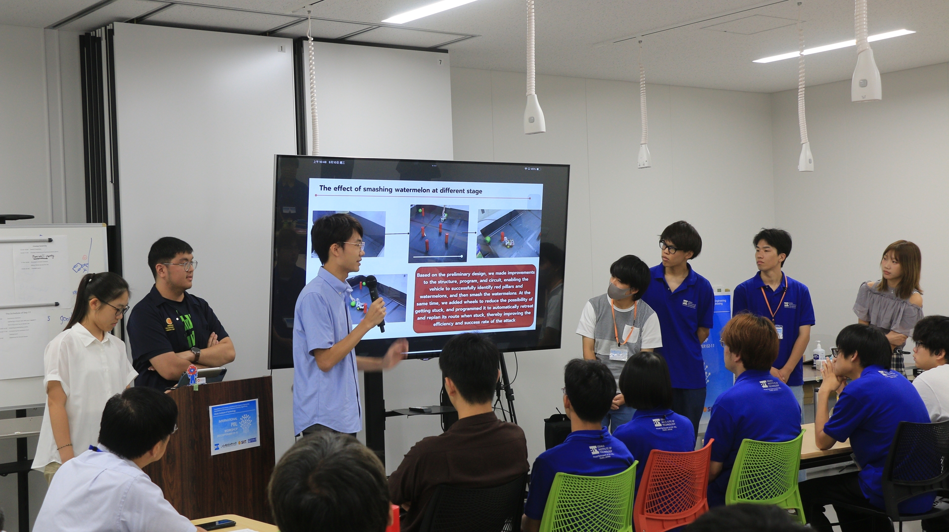 2025年9月3日から10日まで電子情報システム工学科・電気電子システム工学科の国際PBLが開催されました。本年は台北科技大(台湾)、タマサート大(タイ)、同済大(中国)が参加し、本学の学生と合わせて総勢40名でスイカ割りロボットの制作を行いました。ロボットは誰かがリモートで操縦するのではなく、スイカに見立てた紙風船の認識から距離の判断、ロボットアームの駆動を全て自動で行うようにプログラミングします。言葉や専門の異なる学生同士6人が一つのチームとなり、それぞれユニークな形状を持つロボットを制作しました。